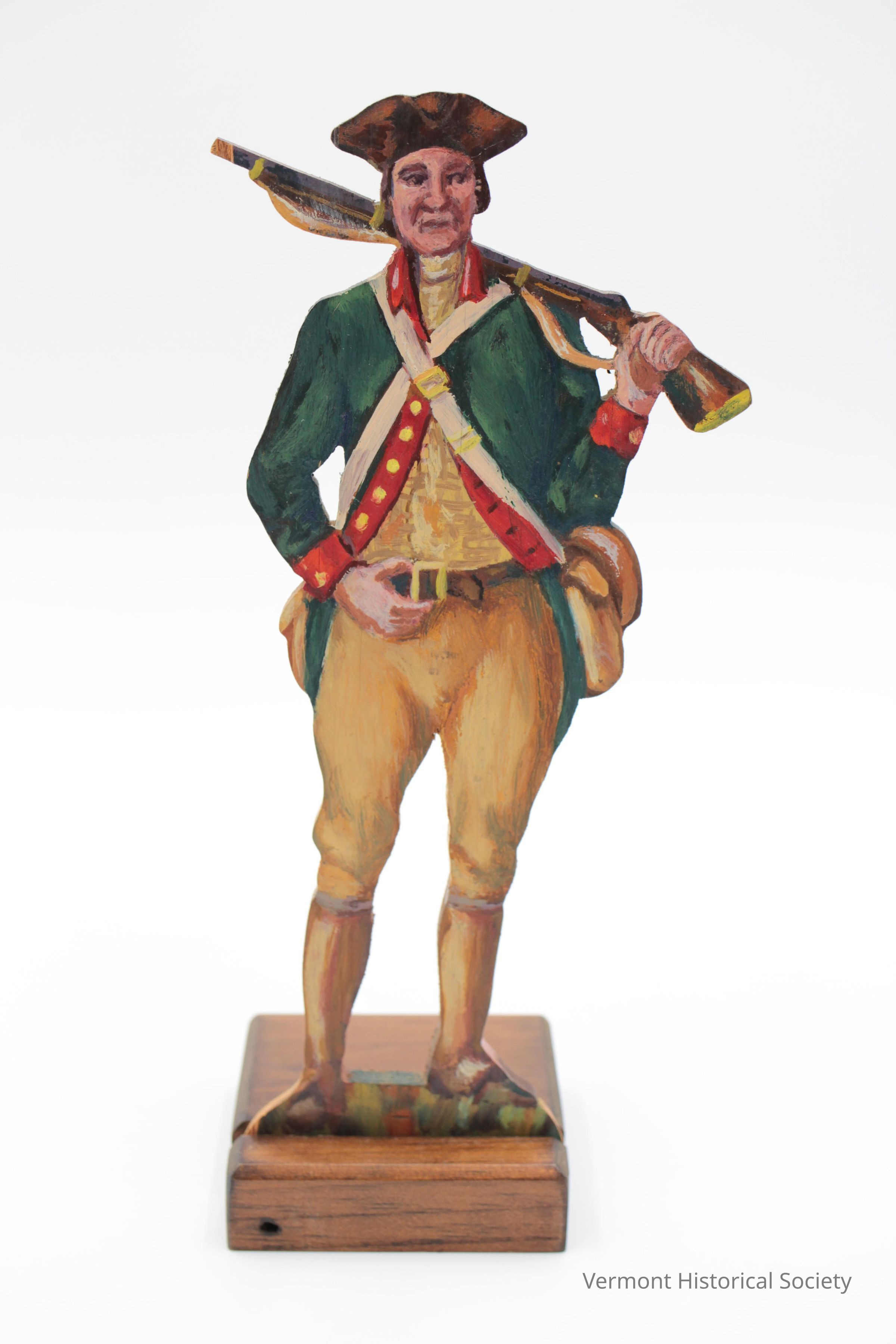 Plywood cutout figurine of soldier. The figure is painted on the front, and the plywood is left bare on the reverse. The soldier is shown wearing an eighteenth-century-style military uniform consisting of a brown tricorn hat, a green coat edged in red, a yellow plaid shirt, fawn breeches and stockings, and brown shoes. He is holding a long gun over his left shoulder. The figure sits in a slot within a rectangular wooden base. The back is incised with the inscription, "Green Mountain Ranger / Parade Uniform / Horace Mills Abrams".Context