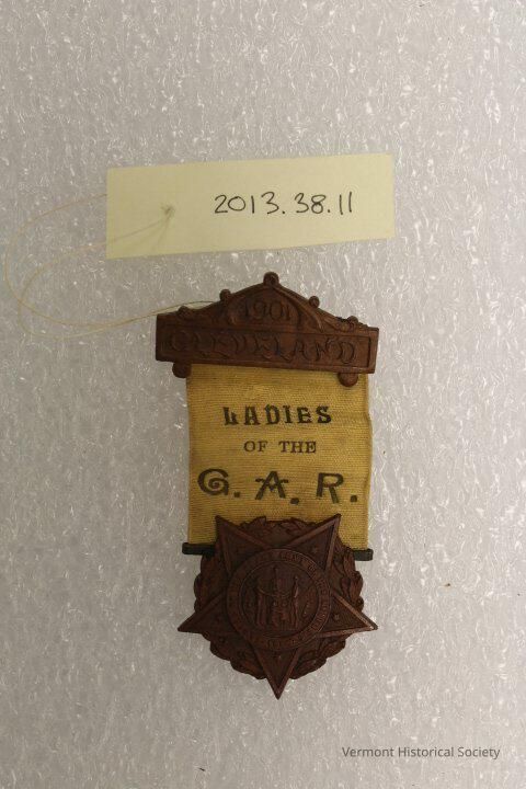 Bronze bar pin with 1901 and CLEVELAND stamped into the metal. Attached to this is a short yellow ribbon with LADIES OF THE G.A.R. stamped in gold lettering. at the bottom of this hangs a bronze round medal with a star on top of a wreath and a circle in the center reading LADIES OF THE GRAND ARMY OF THE REPUBLIC 1886
