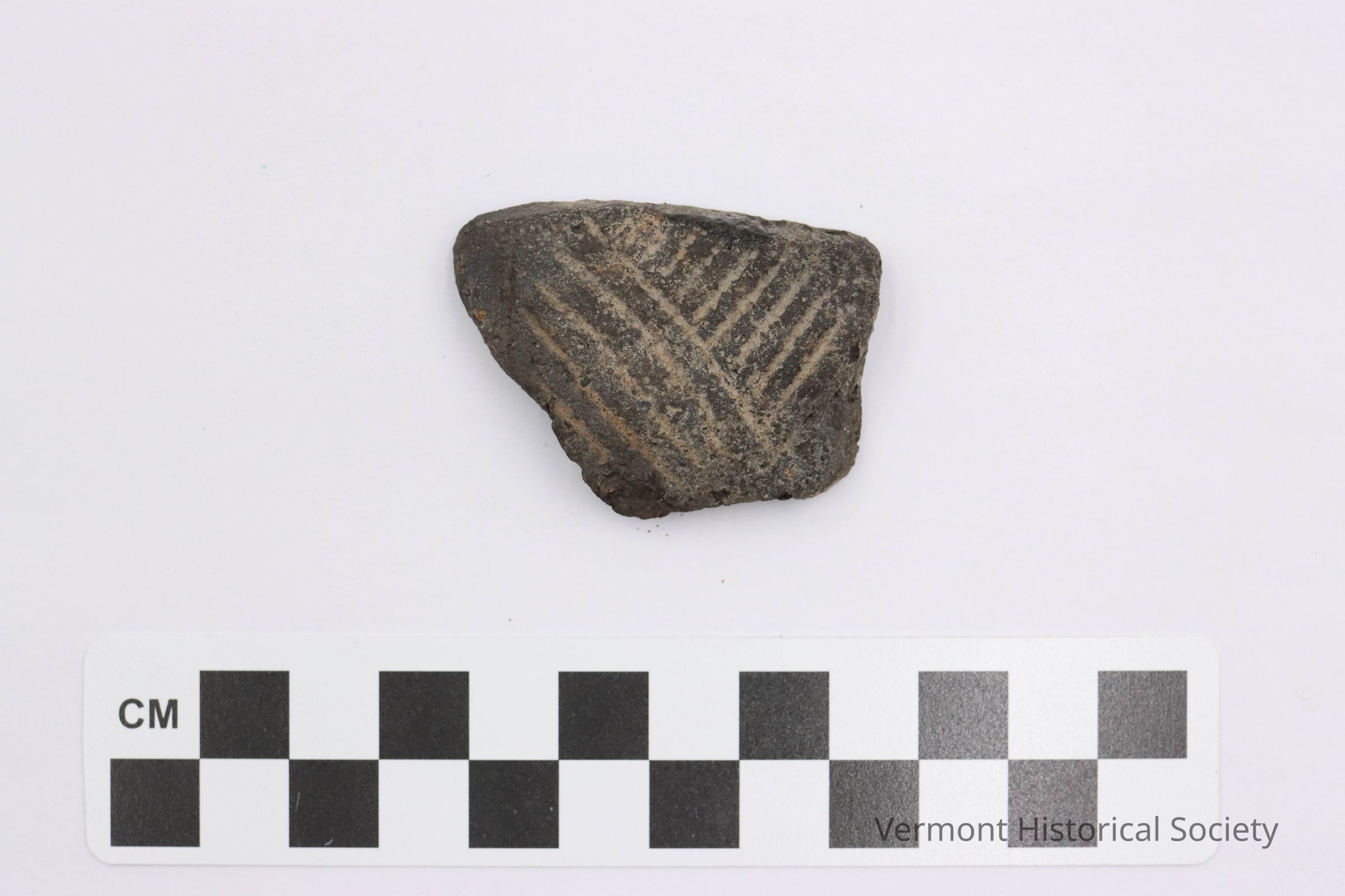 Pottery rim sherd decorated with an oblique chevron pattern. The lip is beveled.
