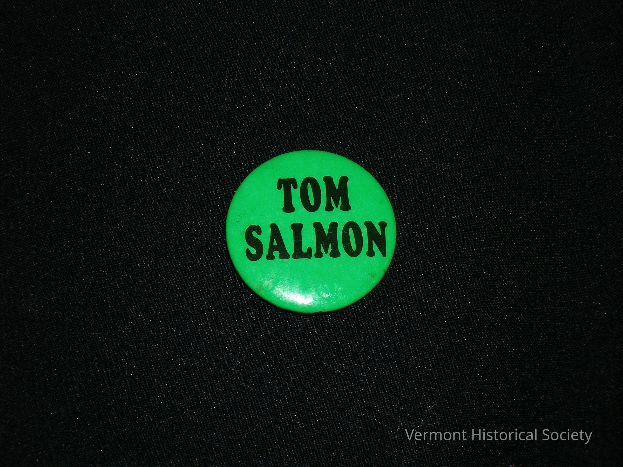 Round green button. Taking up the center of the pin is the name "TOM / SALMON" written in black.