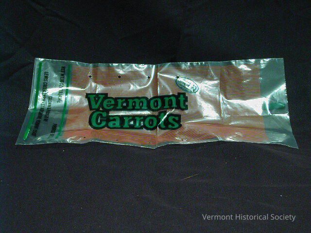 Plastic bag for carrots. The plastic bag is a rectangular shape and made from see-through plastic. Four holes are pierced into the front of the bag and a thick black line with the number “984” at the end, and a triple-R on the back, extends from the bag’s opening. The bag has tightly compressed printed orange lines, “Vermont Carrots” in bold green and black lettering, and a stamp-like oval containing images of fruits and the words “FRUITS & / Vermont / VEGETABLES/ good ‘n fresh.” Two green parallel lines frame the black write that reads, “NET WT. 16 OZ. (1LB.) 454g / PRODUCE OF U.S.A. / GROWN & PACKED BY / LEWIS CREEK FARM ● STARKSBORO, VERMONT 05487,” above the bottom seam.Acquisition