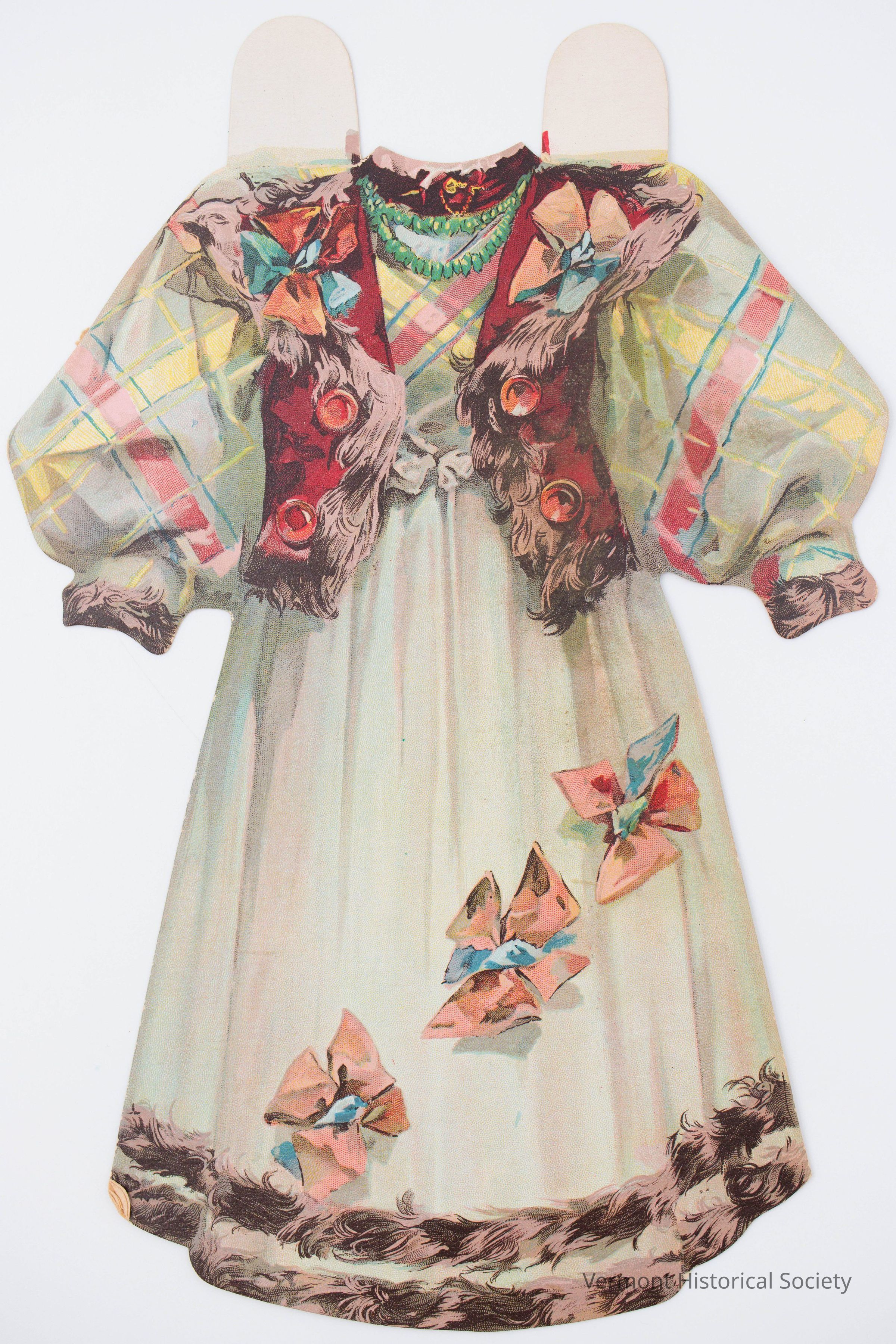 Large paper doll dress. The dress is white with pink and yellow plaid on the bodice and sleeves. It has large, puffed sleeves and a red vest. There are two white tabs at the shoulders.Context