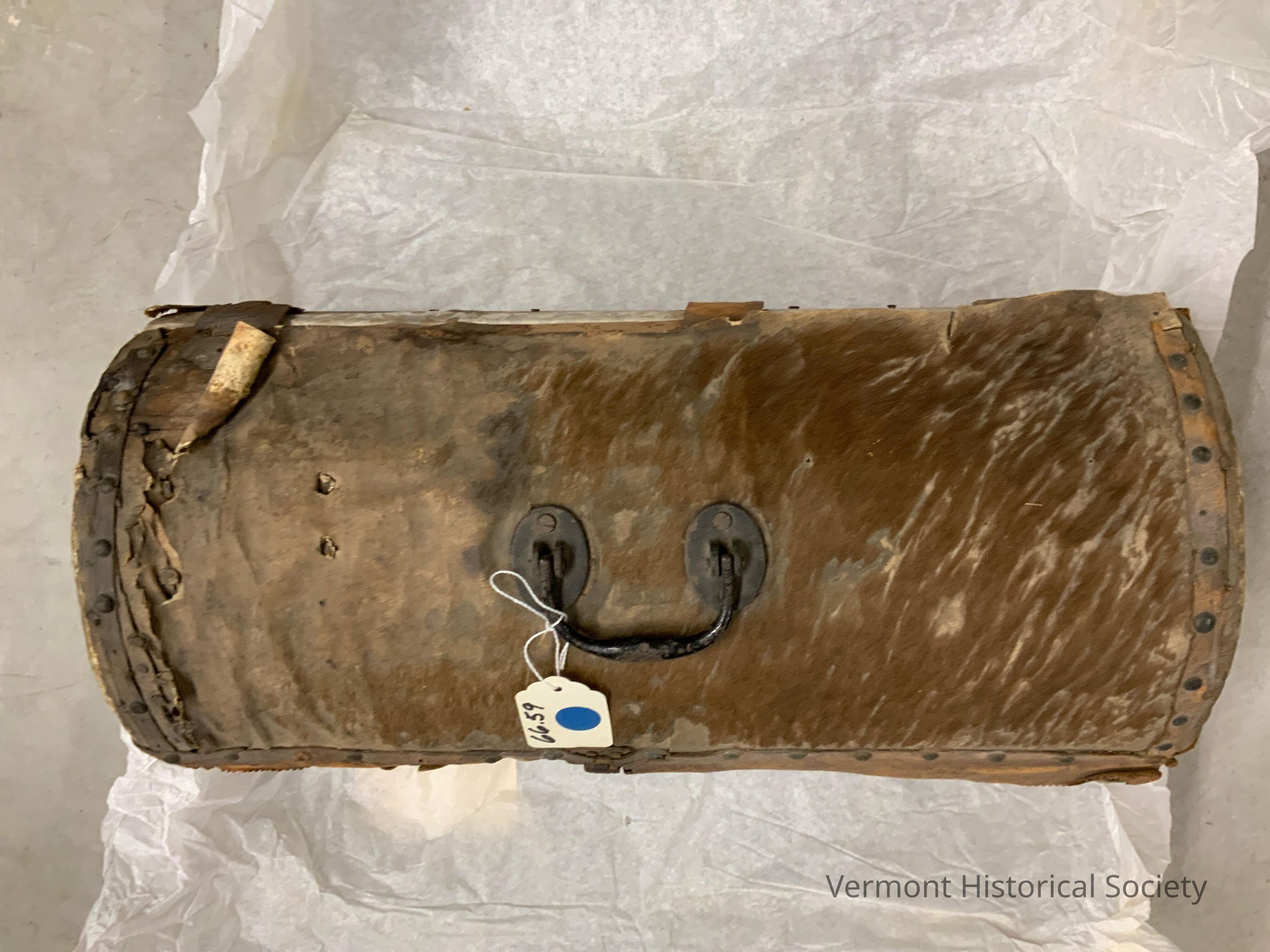 Hide-covered traveling trunk with a rounded top. There is a metal handle at the center top. The edges of the hide are held down with strips of metal attached with rounded metal brads.