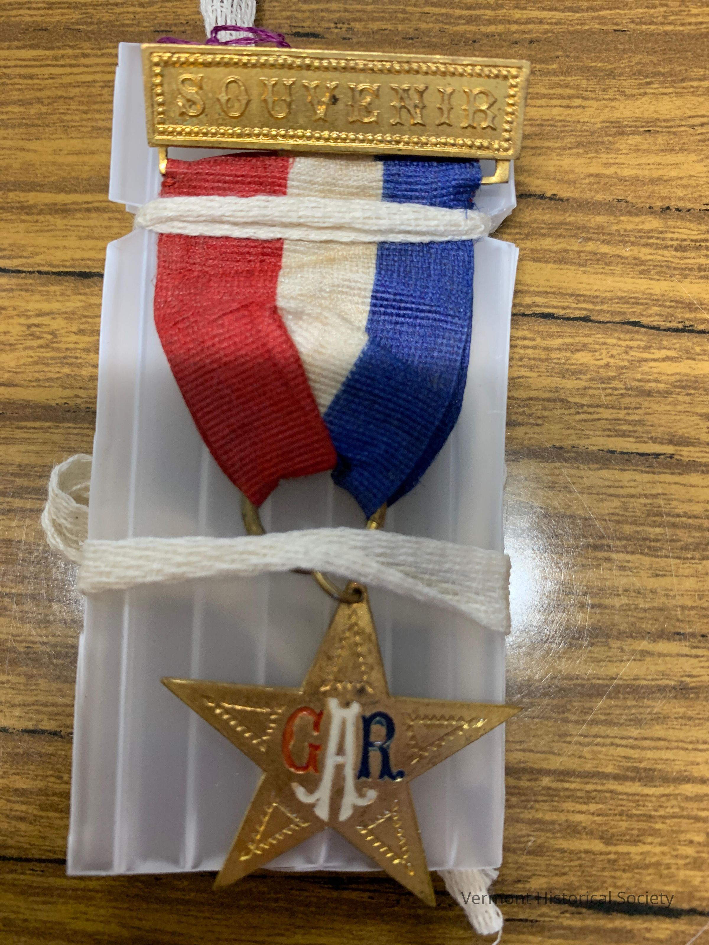 Membership ribbon consisting of an upper bar, a red-white-and-blue silk ribbon, and a star-shaped medallion. The bar is molded with the word, "SOUVENIR". The medallion is molded with the letters, "GAR", which are enameled red, white, and blue.Context