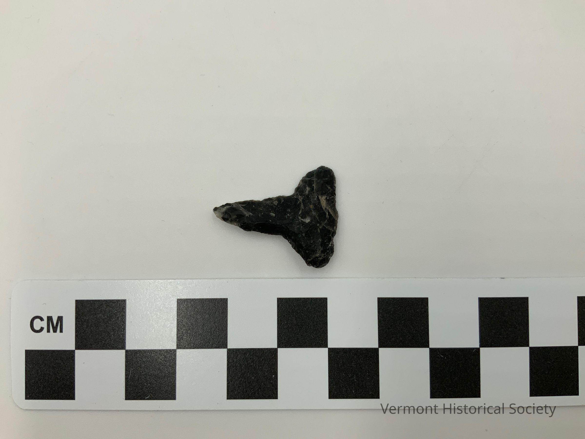 Chipped stone drill made of black chert. The base is wide, and the drill is symmetrical with straight blade edges.Context