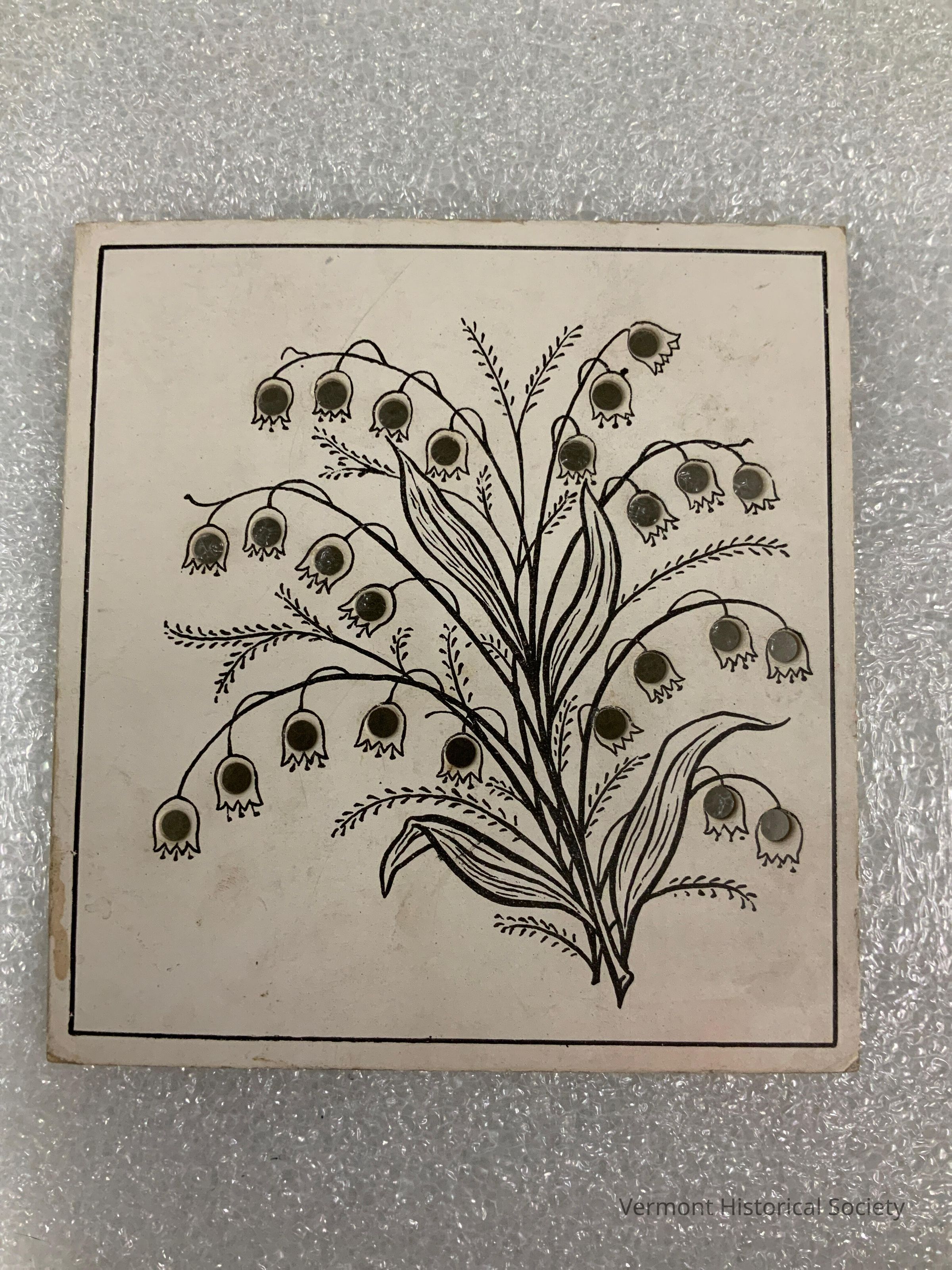 Square cardboard sewing card printed on one side with a line drawing of cut stems of bellflowers. Each flower is punched with a round hole.