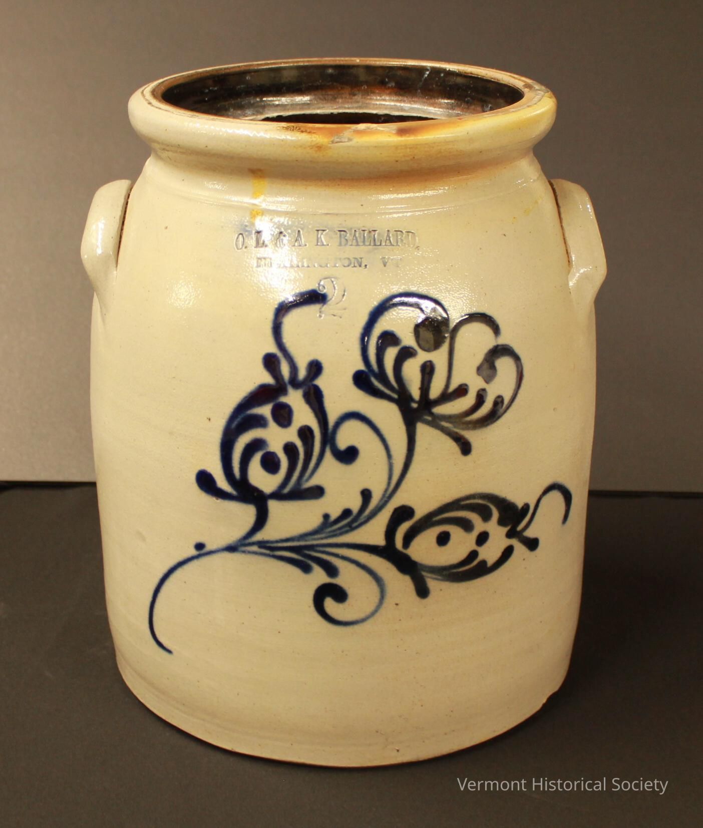 Stoneware crock with large hand-painted design of flowers (possibly tulips) across the center front. There are U-shaped handles on either side. The top rim is flared outward to fit a small round ceramic lid, now missing, and the interior is glazed dark brown. At the center top is the stamped label, "O. L. & A. K. BALLARD. BURLINGTON. VT. 3". There is a small round lid that sits inside the rim and has a round center post handle.Context