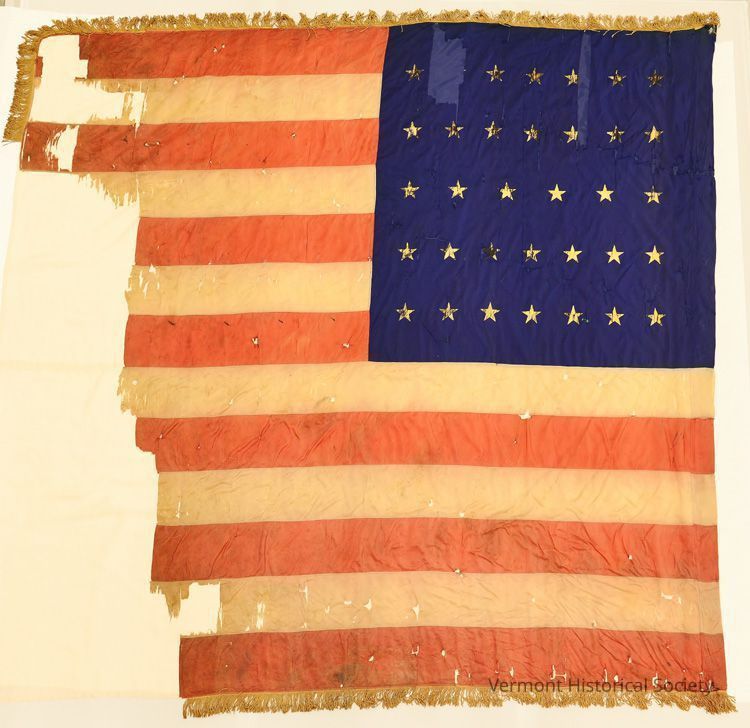 3rd Vermont Infantry Regiment national flag. Flag attached to staff by a sleeve. The canton style is square, and is 39.5 in by 38 in. There are 34 gold painted stairs, and their arrangement is 7-7-6-7-7. The stripes are a strong red color and are 5 1/2 in wide. Some fringe present.