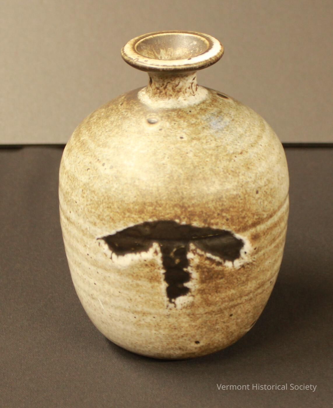 Ceramic bud vase with a short narrow neck and opening. The piece has a flat glaze in shades of grey and brown. On opposite sides are large, squat T-shaped designs in brown with white edges. The bottom of the vase is marked, "Benedictine Monk Weston Vermont", surrounding a symbol that resembles a capital cursive L.
