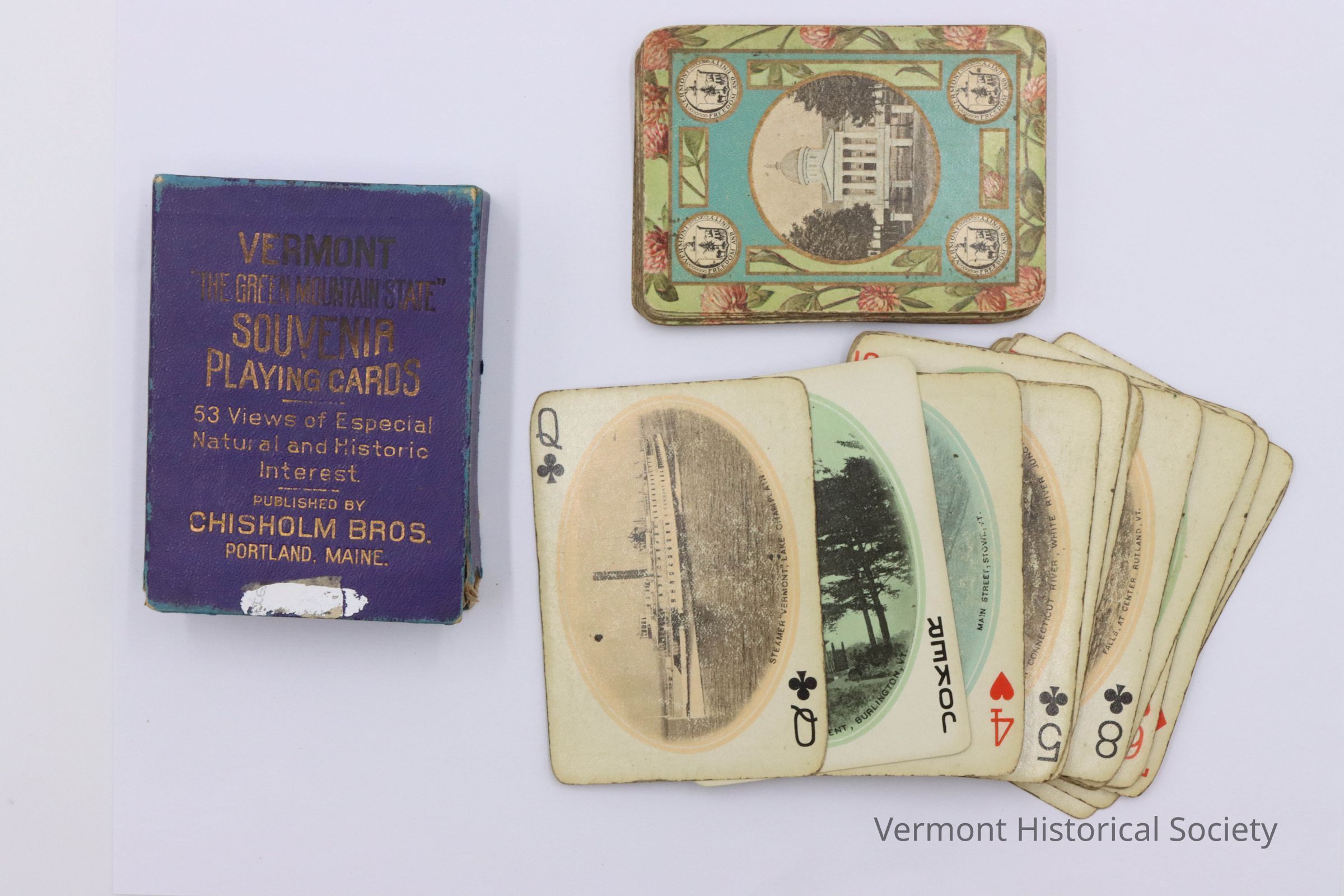 Deck of 53 cards showing scenes of Vermont. The back of each card has a picture of Vermont State capital with state seal and border of state flower, the red clover. The deck is in its original blue box, which has the gold label, "VERMONT "THE GREEN MOUNTAIN STATE" SOUVENIR PLAYING CARDS 53 Views of Especial Natural and Historic interest PUBLISHED BY CHISHOLM BROS. PORTLAND, MAINE."