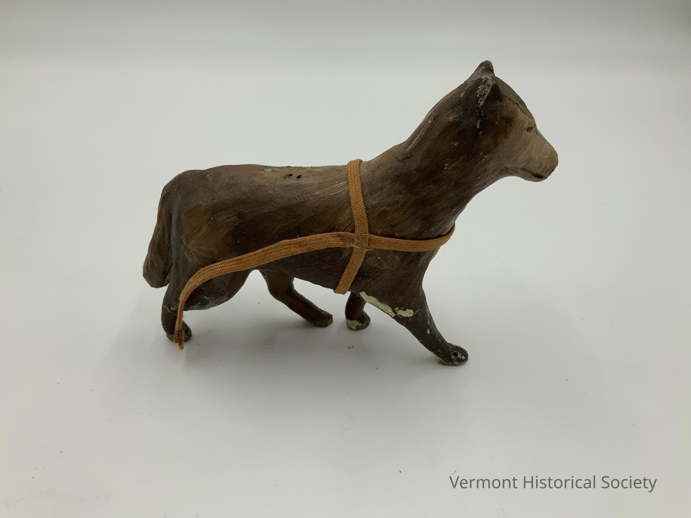 Miniature, painted cast-iron sled dog. The dog is molded to appear as if it's walking, and there is a harness made of woven cotton tape around its body. It is painted in shades of brown. Its tail is lowered behind it.