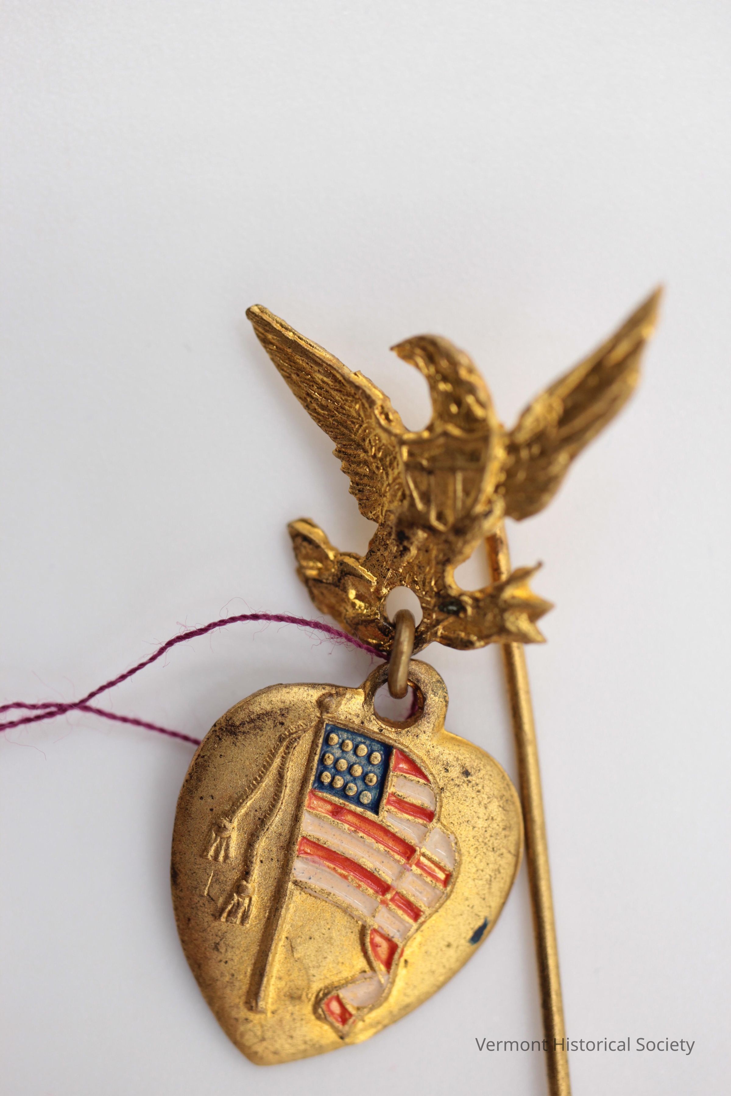 Gold stickpin topped with a spread eagle and with a small heart-shaped medallion. The medallion is molded with a United States flag and enameled in red, white, and blue.