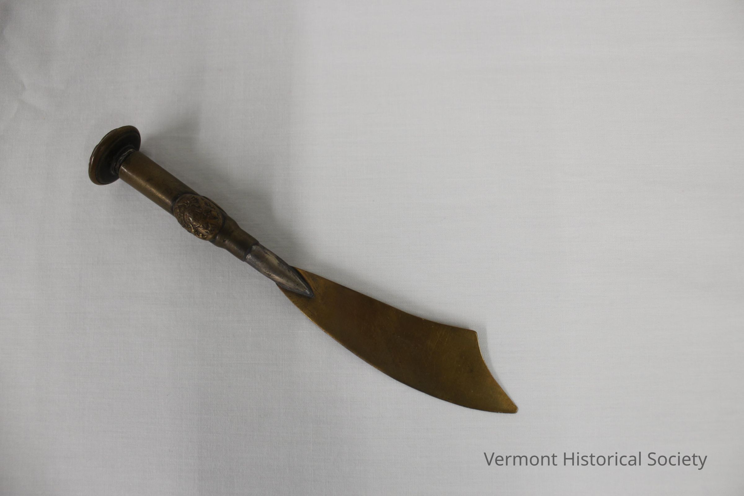 Brass tool that could be a letter opener or a butter knife. Has insignia on the top of the handle and on the sides. The insignia features a lion on the lift, a unicorn on the right, a crown with another unidentifiable animal on top, a seal in the middle with unreadable lettering and two banners at the bottom, also with unreadable lettering. Smaller versions of the insignia on top adorn the sides of the handle.Context