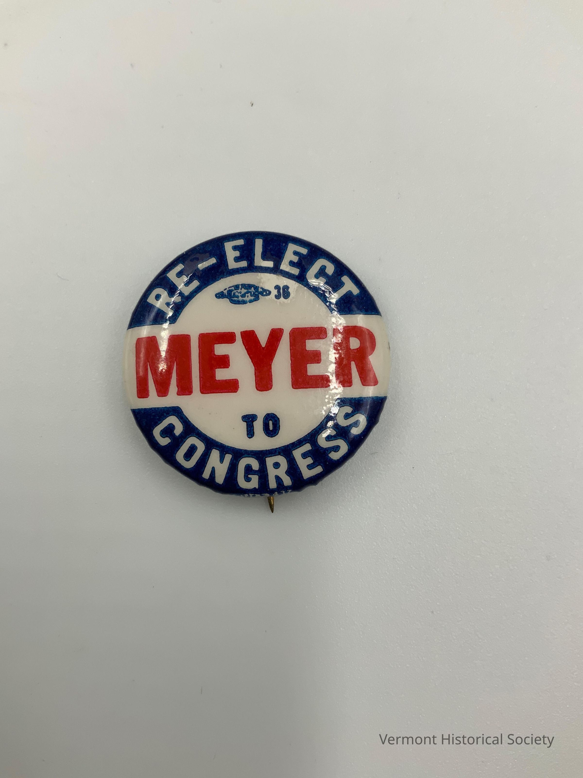 Round white button. There is a blue ring around the edge of the pin that has a break in the center of the pin due to the word "MEYER" that is written in red. Along the top edge of the button, in the blue, "RE-ELECT" is written in white. Along the bottom edge of the button, in the blue, "CONGRESS" in written in white. In the center of the pin above MEYER is a stamped logo and the year 36 and below MEYER is "TO" written in blue.