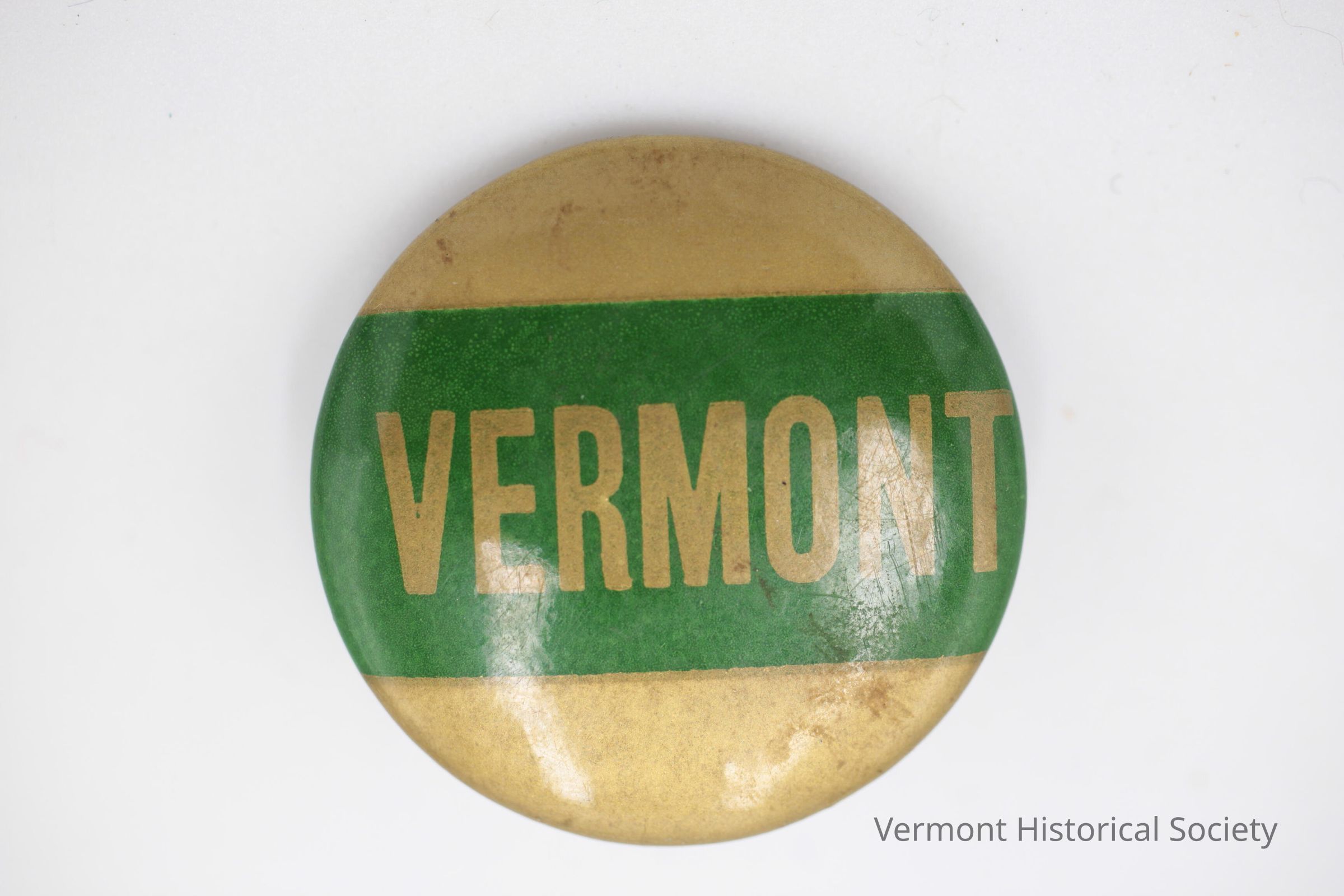 Round metal button printed in green and gold with the word, "VERMONT".Context