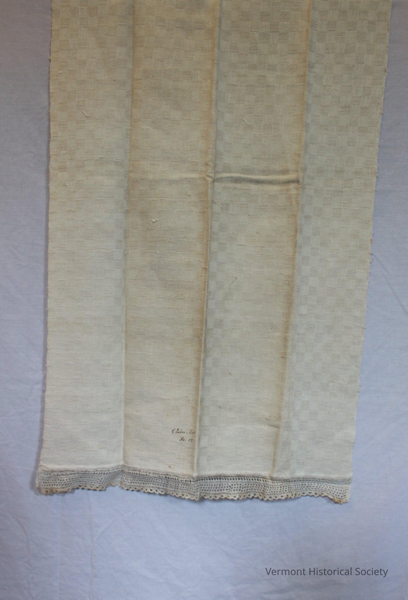 Linen town with a knitted lace border. The towel is woven in a twill weave that alternates between warp- and weft-faced, giving it a checkered appearance. One end is inked with the label, "Elvira Scott No. 17." The long edges of the towel are selvedges, and both short edges are hemmed.Context