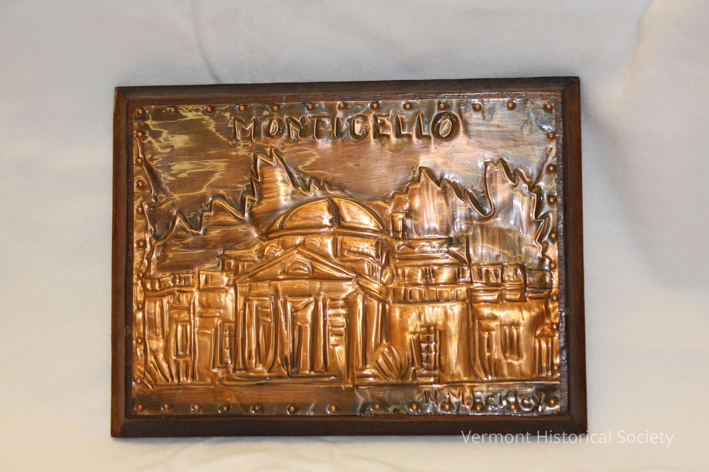 Embossed copper plaque shaped with an image of the front elevation of a neoclassical house with columns and central dome. The image is labeled, "MONTICELLO", and signed, "N.M.Eckley". The plaque is mounted onto a rectangular wooden base with copper brads.Artwork Details
