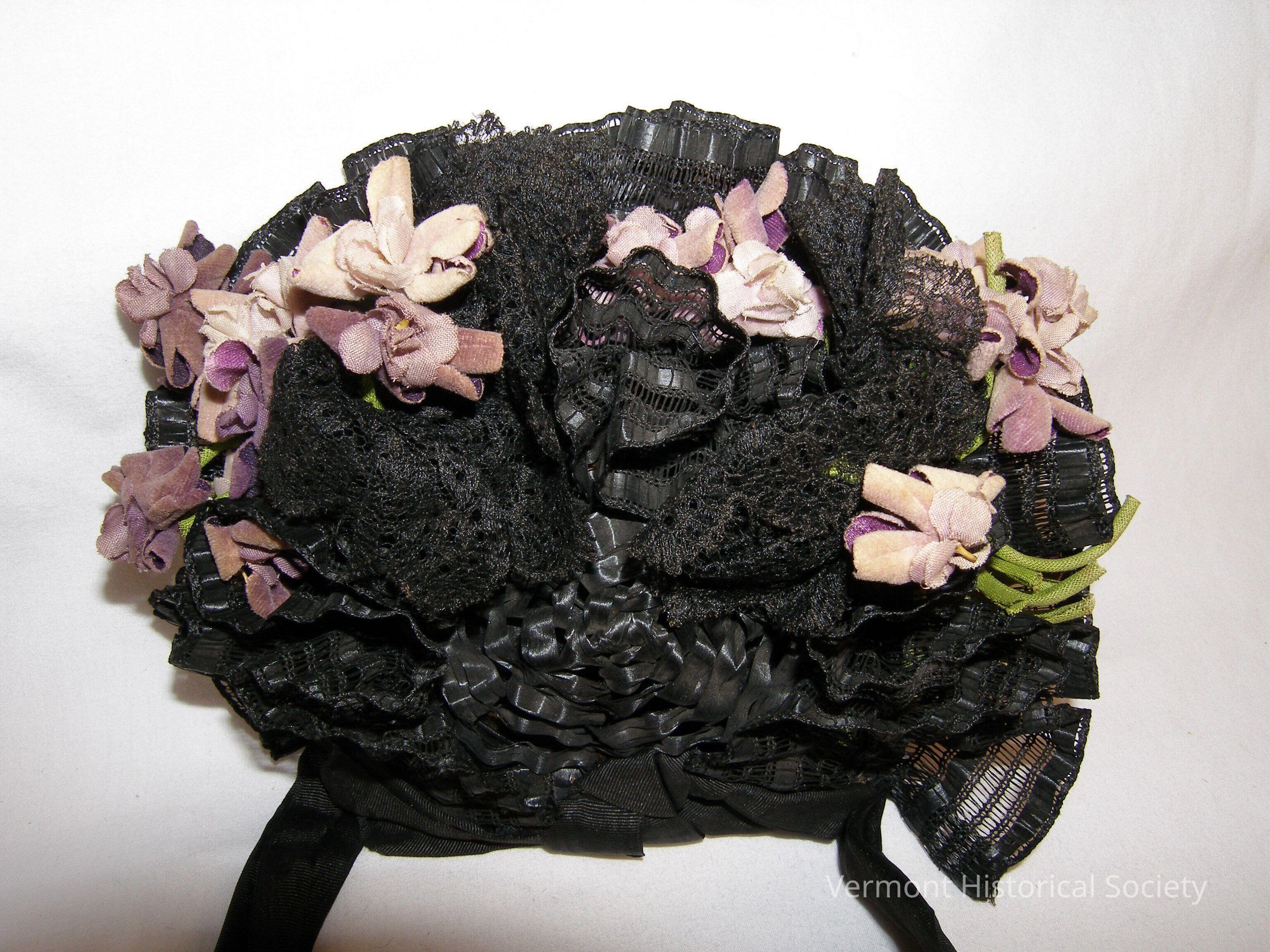 Black hat or bonnet. The exterior is covered with loops and pleats of black silk and lace ribbons as well as pink and purple silk flowers. The interior is lined with silk. There are two silk ribbons that tie together beneath the wearer's chin.