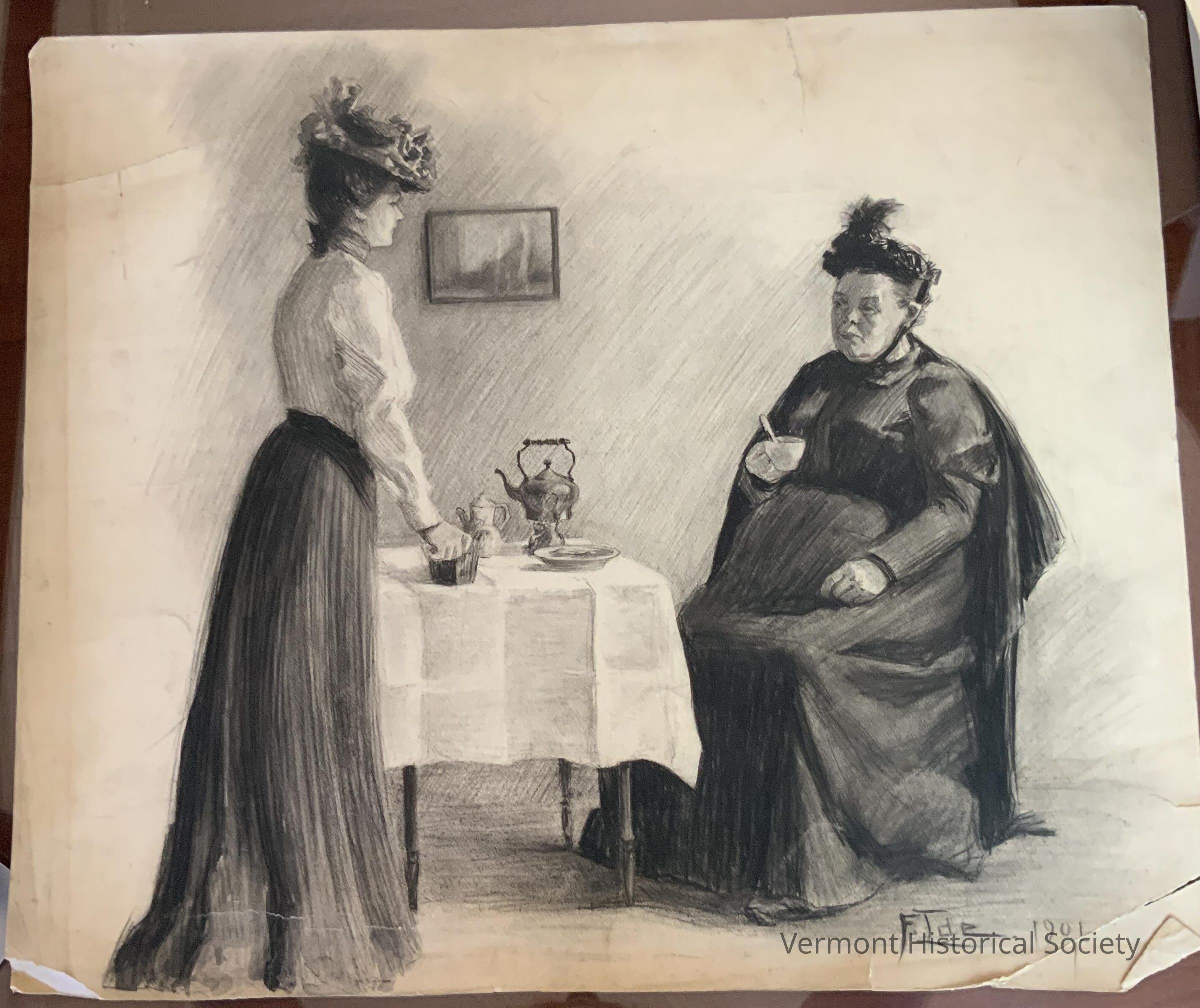 A drawing of two women having tea. One is standing and the other sits at a table. One corner is torn (b). It is signed in the bottom right corner and dated 1901. On the back is written “Frances Ide 68 West 10th St.”Type of Drawing