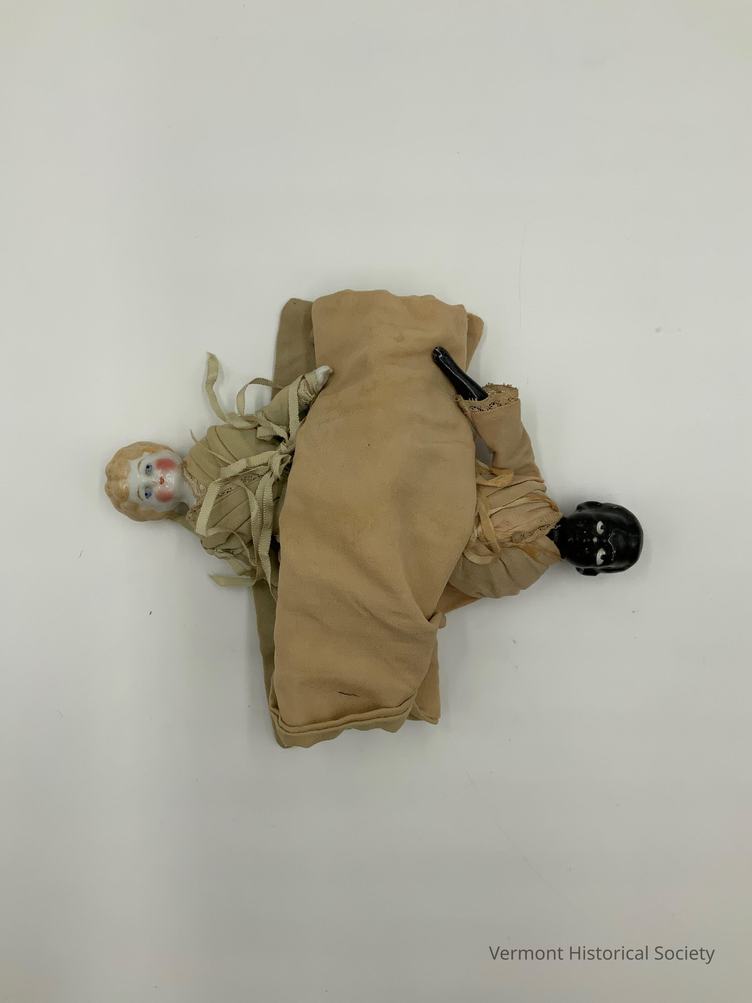Two-headed doll. The porcelain heads are set opposite each other--where the other head's feet would usually be. There are long, triangular pieces of fabric attached to the waist(s) that fall like a skirt to cover whichever head is pointed down. One head is black with short molded black hair and white painted eyes. There is one black porcelain hands attached to right arm. The other head is white with short molded yellow hair, outlined eyes and brows, and pink painted cheeks and lips. Both porcelain hands are missing. Each bodice is wrapped in a beige robe-like surplice bodice trimmed with ribbon.Context