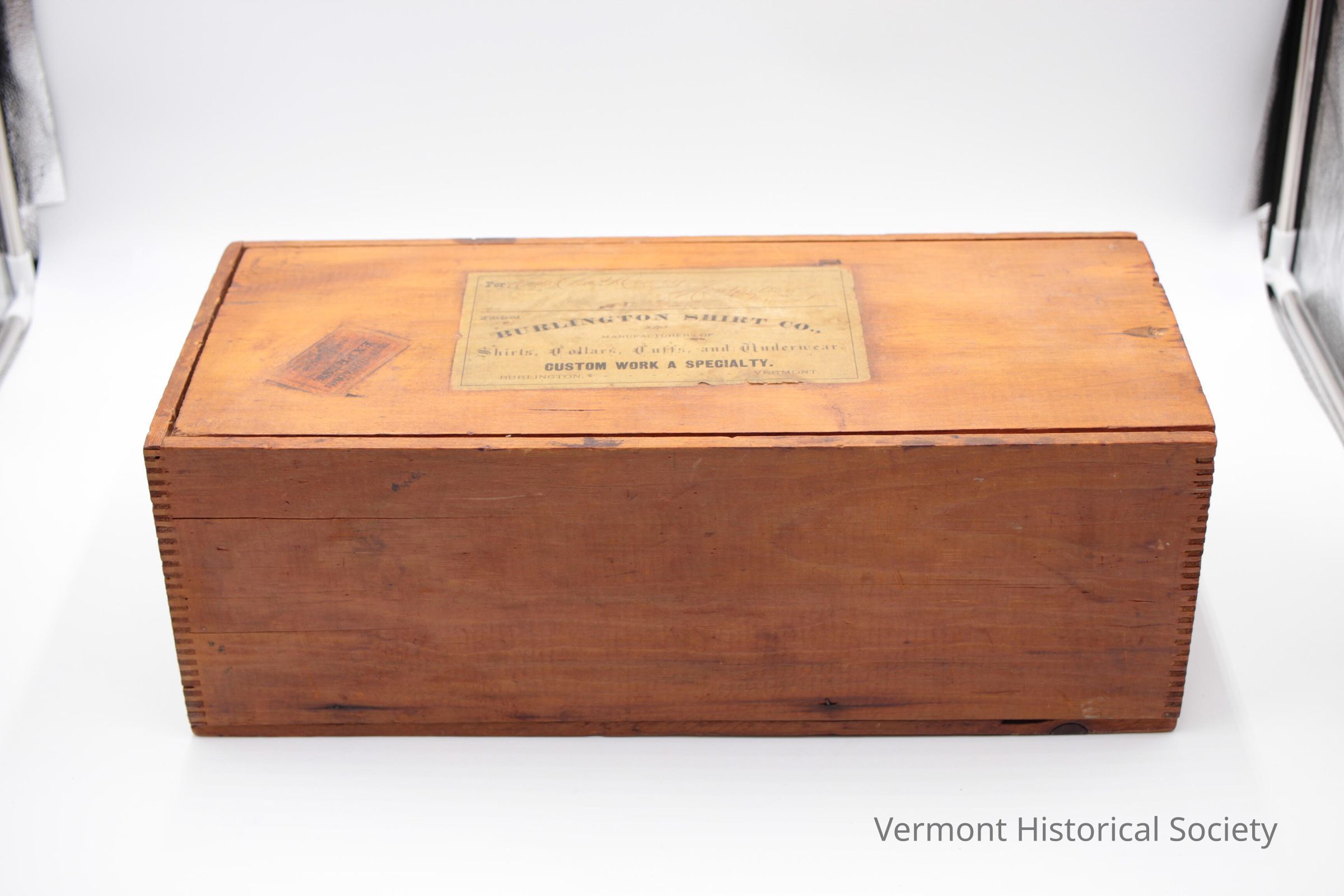 Long, rectangular wooden box with sliding lid and box-jointed corners. The lid bears two pasted-on paper labels: a large, white (now yellowed) label and a small red label. The large label is addressed by hand to "Hon. Chas. Dewey/Montpelier, Vermont" and is printed with the inscription, "BURLINGTON SHIRT CO.,/MANUFACTURERS OF/Shirts, Collars, Cuffs, and Underwear./CUSTOM WORK A SPECIALTY/Burlington . . . Vermont." The smaller label is printed with, "United States & Canada/EXPRESS/Burlington VT."Use