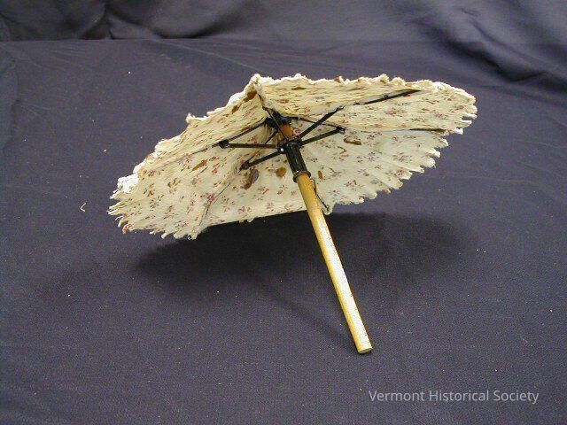 Miniature umbrella sized for a doll. It has six ribs, and a wooden handle. The cover is made of cotton printed with pink and blue flowers. The edges of fabric are pinked.