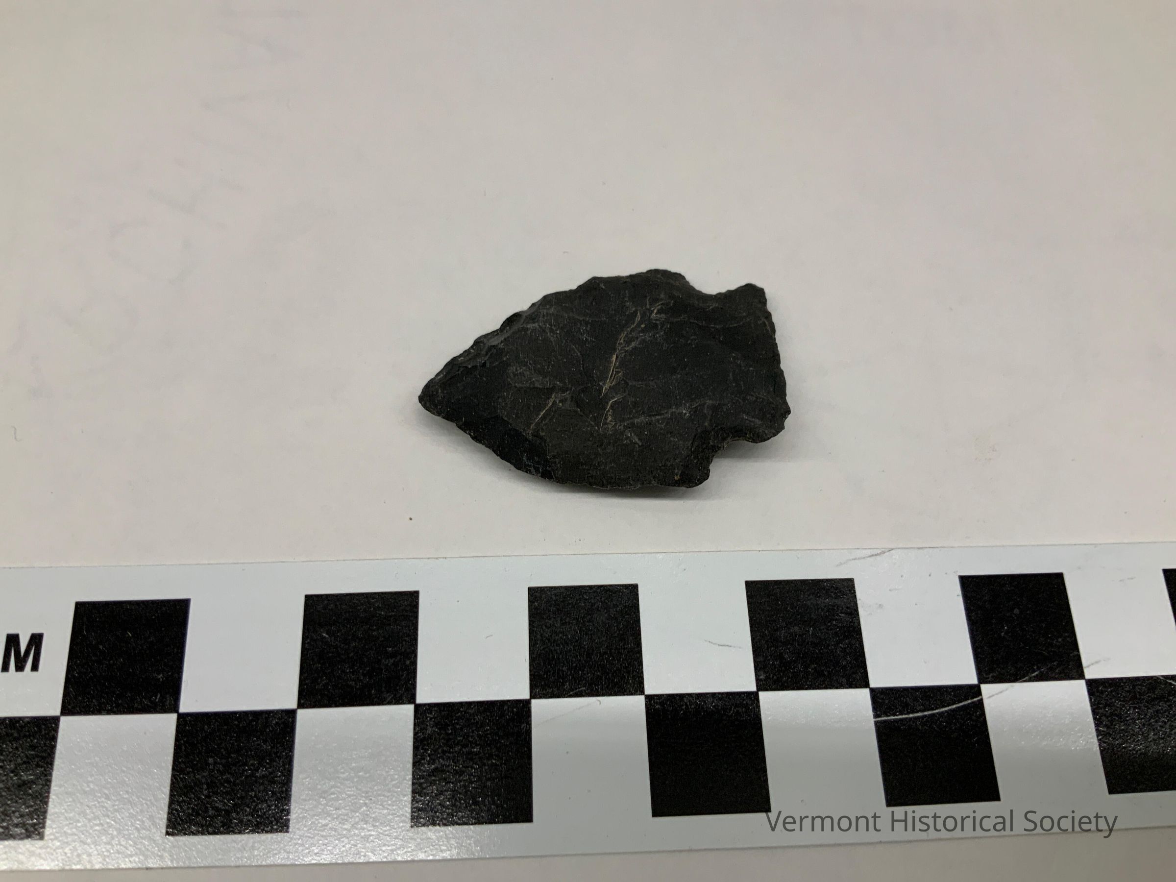 Black chip stone projectile points with corner notches. The base is straight and the blade edges curve outward. It has a sharp tip.