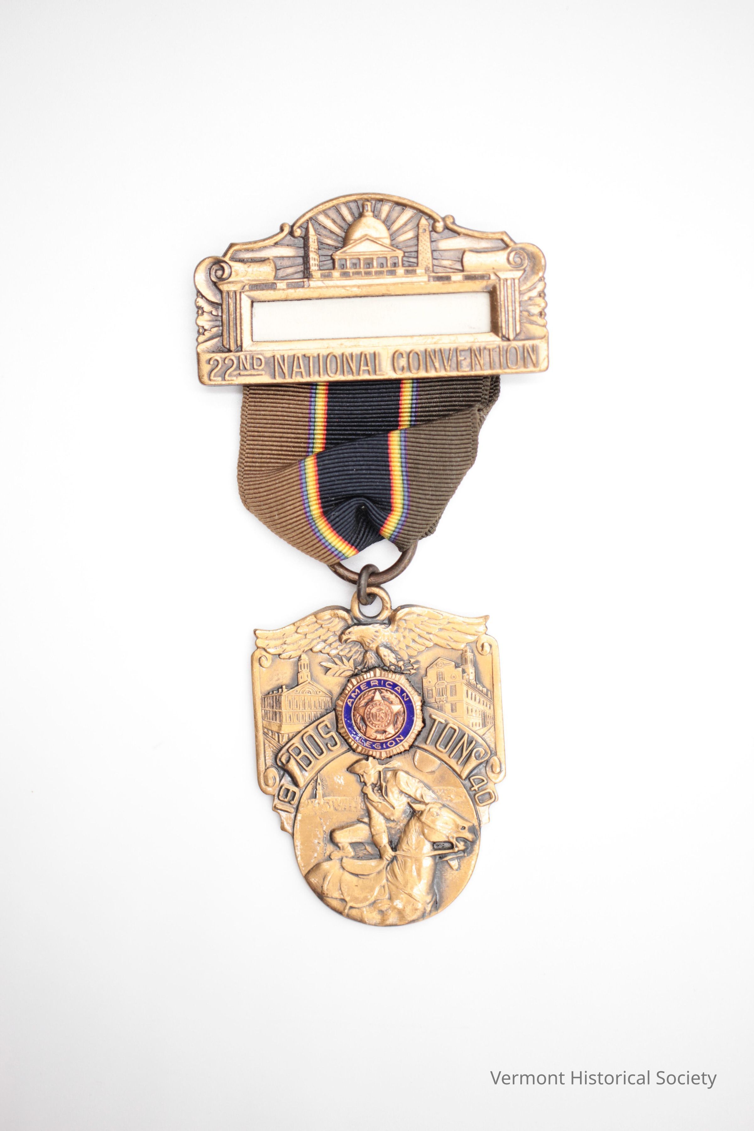 Membership ribbon consisting of a metal name tag, a red grosgrain ribbon, and shaped medallion. The name tag is molded with an image of the Massachusetts State House and the words "22ND NATIONAL CONVENTION". There is a hollow window at the center for writing a name. The grosgrain ribbon is striped brown and black, separated by narrow rainbow stripes. The medallion is molded with an eagle and an image of a man mounting a horse and the words, "BOSTON 1940".