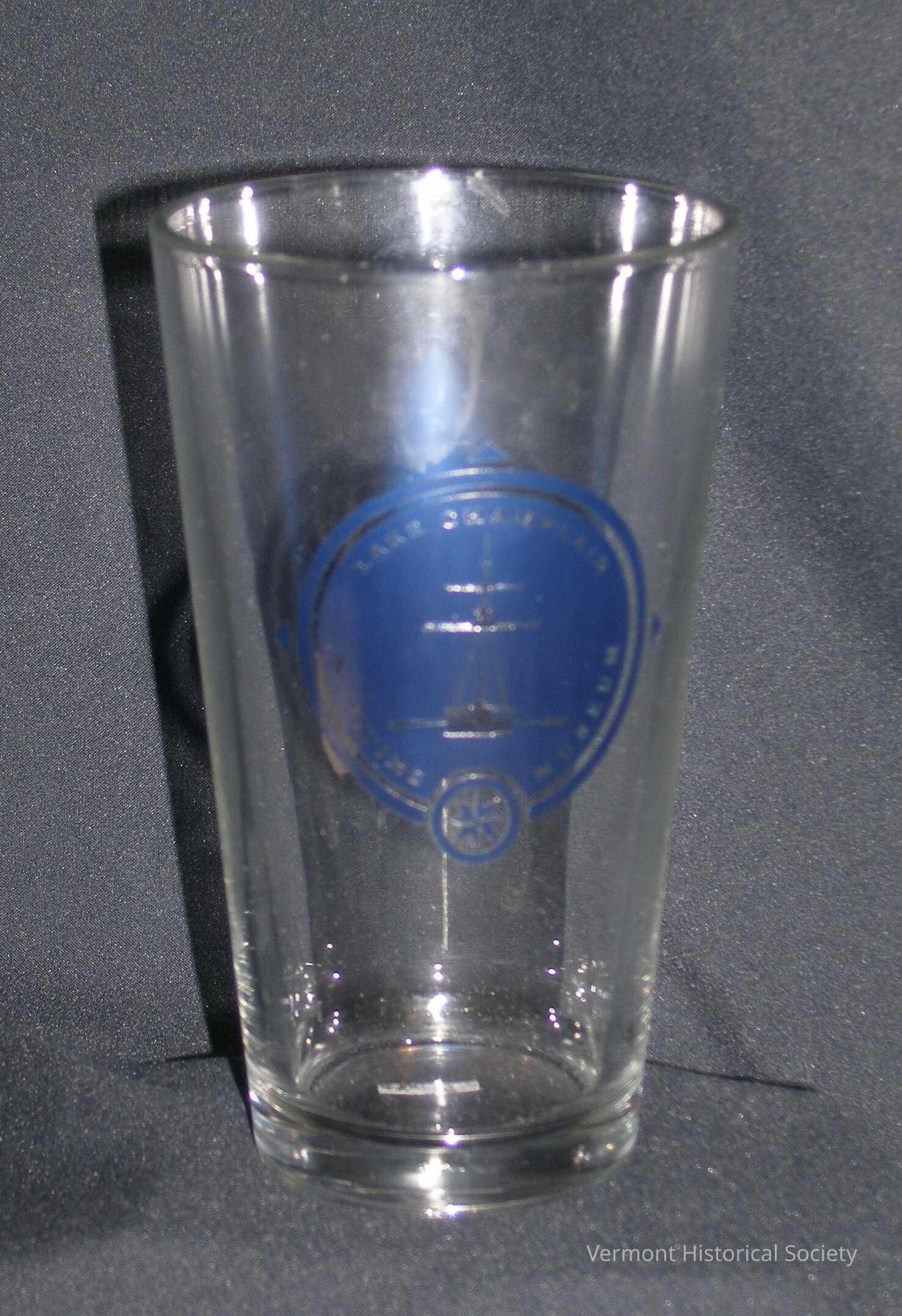 Glass tumbler (pint) printed with a blue logo showing a tall ship from the front. The words "LAKE CHAMPLAIN MARITIME MUSEUM" rings the outside edge of the logo, and there is a compass rose at the center bottom.