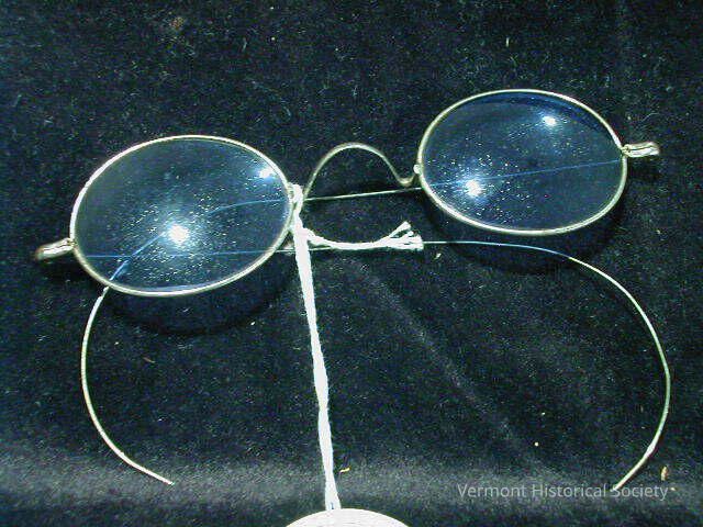 Metal framed glasses with blue-tinted oval lenses. The temples are wire and curve downward at the ends to curl around the wearer's ear.