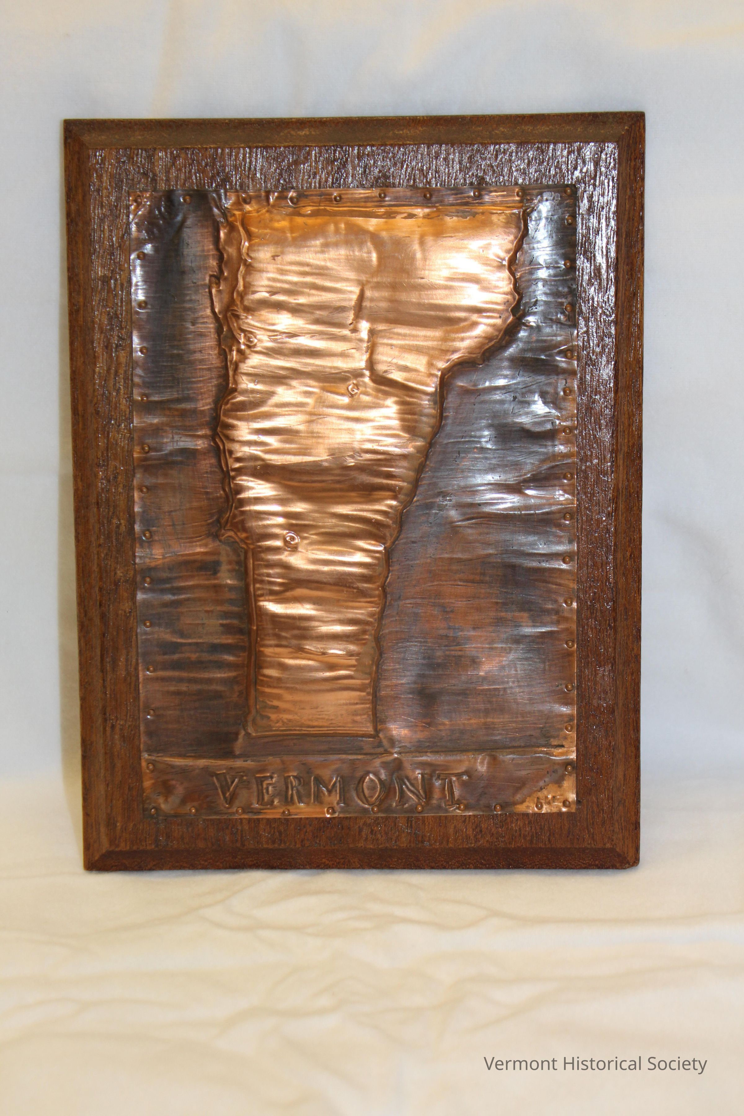 Embossed copper plaque formed into the shape of an aerial map of the state of Vermont. The word, "VERMONT" is embossed into the center bottom. The plaque is attached to a rectangular wooden base with small copper brads.Artwork Details