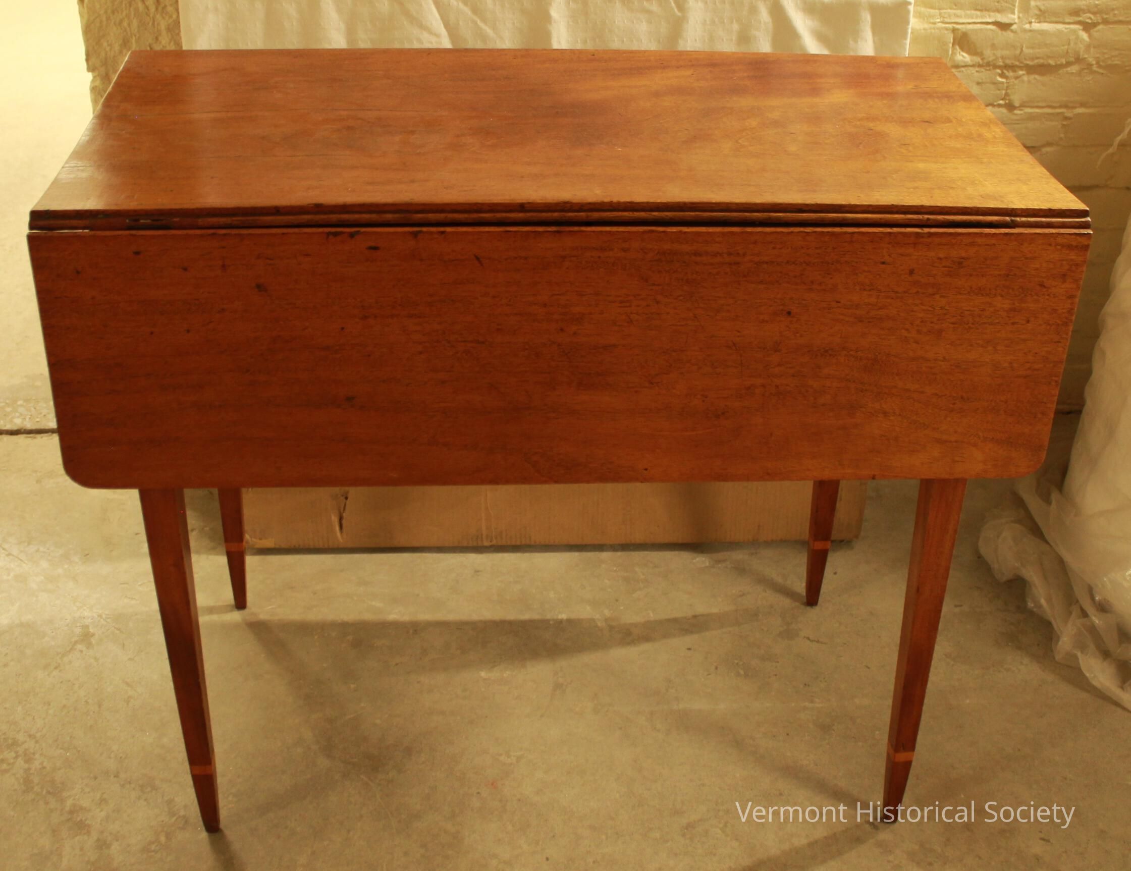 Maple drop leaf table, with tiger maple inlay along the bottom of the side support panels, extending on to the legs. The leaves have rounded corners. The table has straight tapered legs with inlaid banding 3.785 inches from the bottom of each leg. The leaves are supported by a large wood wedge that swings out on wood hinges.