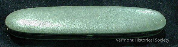 Oval metal eyeglass case. The interior is lined with red fabric.