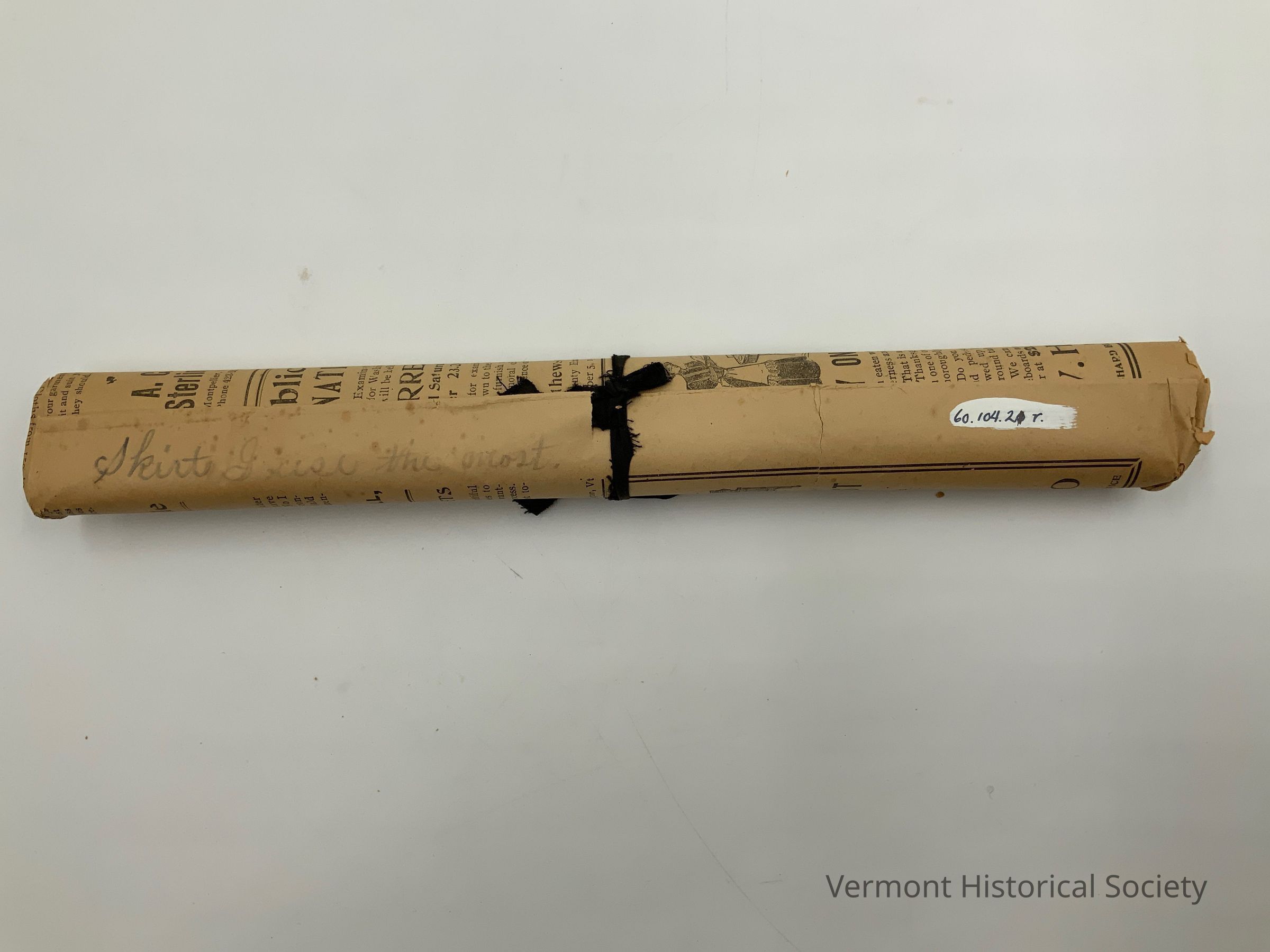Sewing pattern cut from a newspaper. The pattern pieces are folded, then rolled together and tied with a strip of black cotton. The outermost piece is labeled in pencil, "Skirt I use the most.", along one edge.