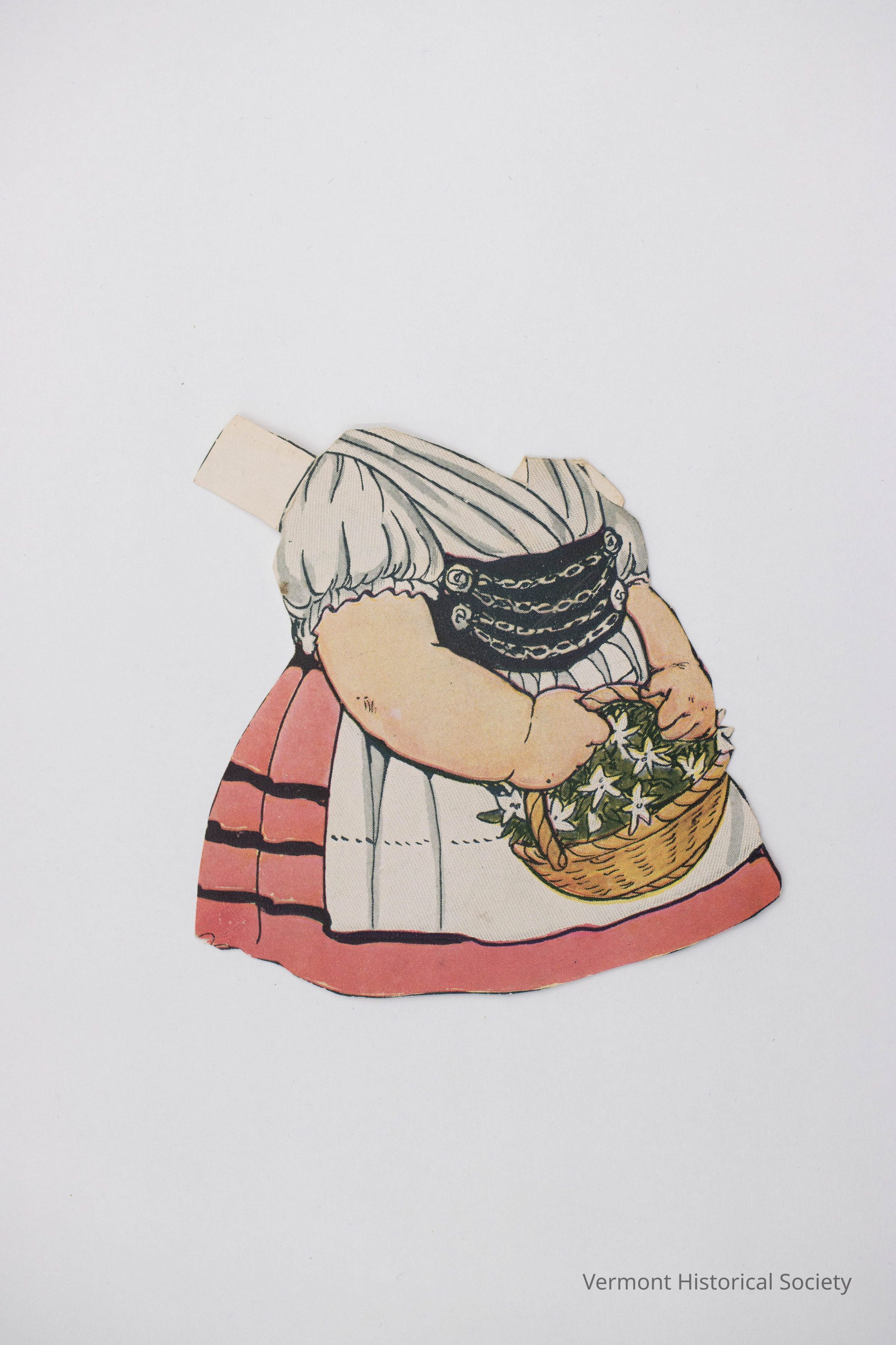 Printed paper folk costume for a paper doll. The costume consists of a dress with a black bodice, pink skirt, and white neckerchief. The bare arms are holding a basket of white flowers. The back shows a portion of a sales catalog page.Context