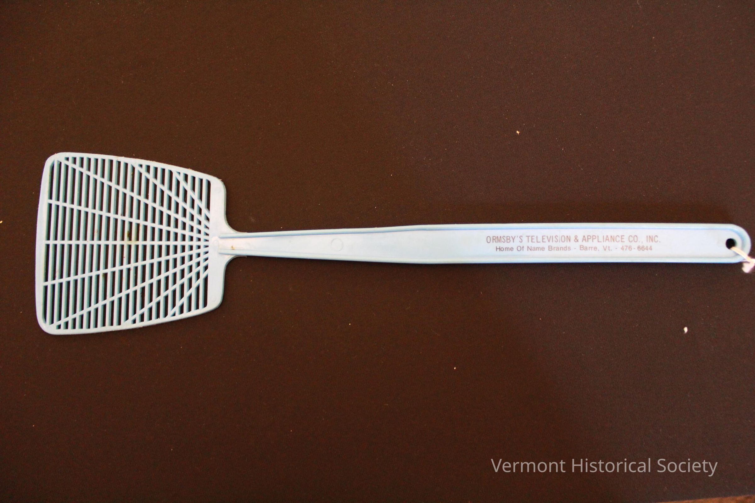 Light blue plastic fly swatter. The handle is printed with the label, "ORMSBY'S TELEVISION & APPLIANCE CO., INC. Home Of Name Brands - Barre, Vt. - 476-6644".