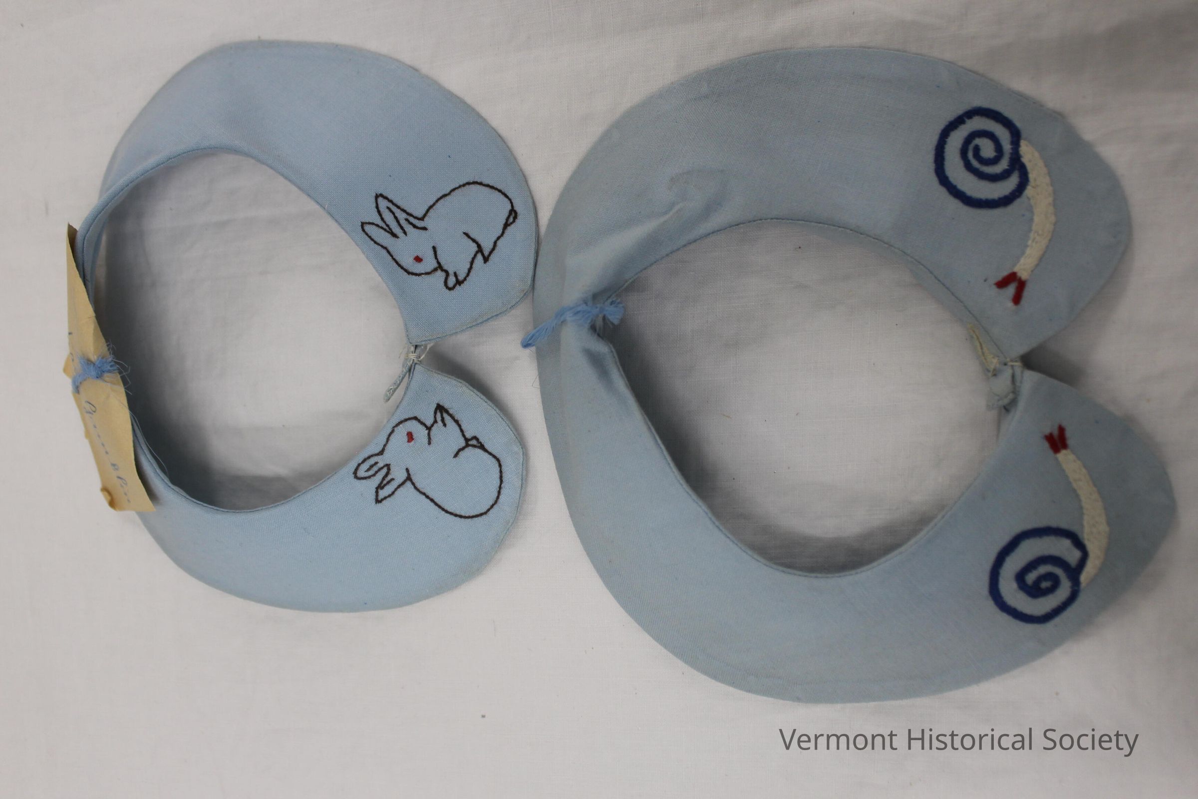 Two light blue attachable collars, with rounded edges in front. One has embroidered rabbits and a card that says it was made by Christiane Gamblin. The other features snails and doesn't have a card.Context
