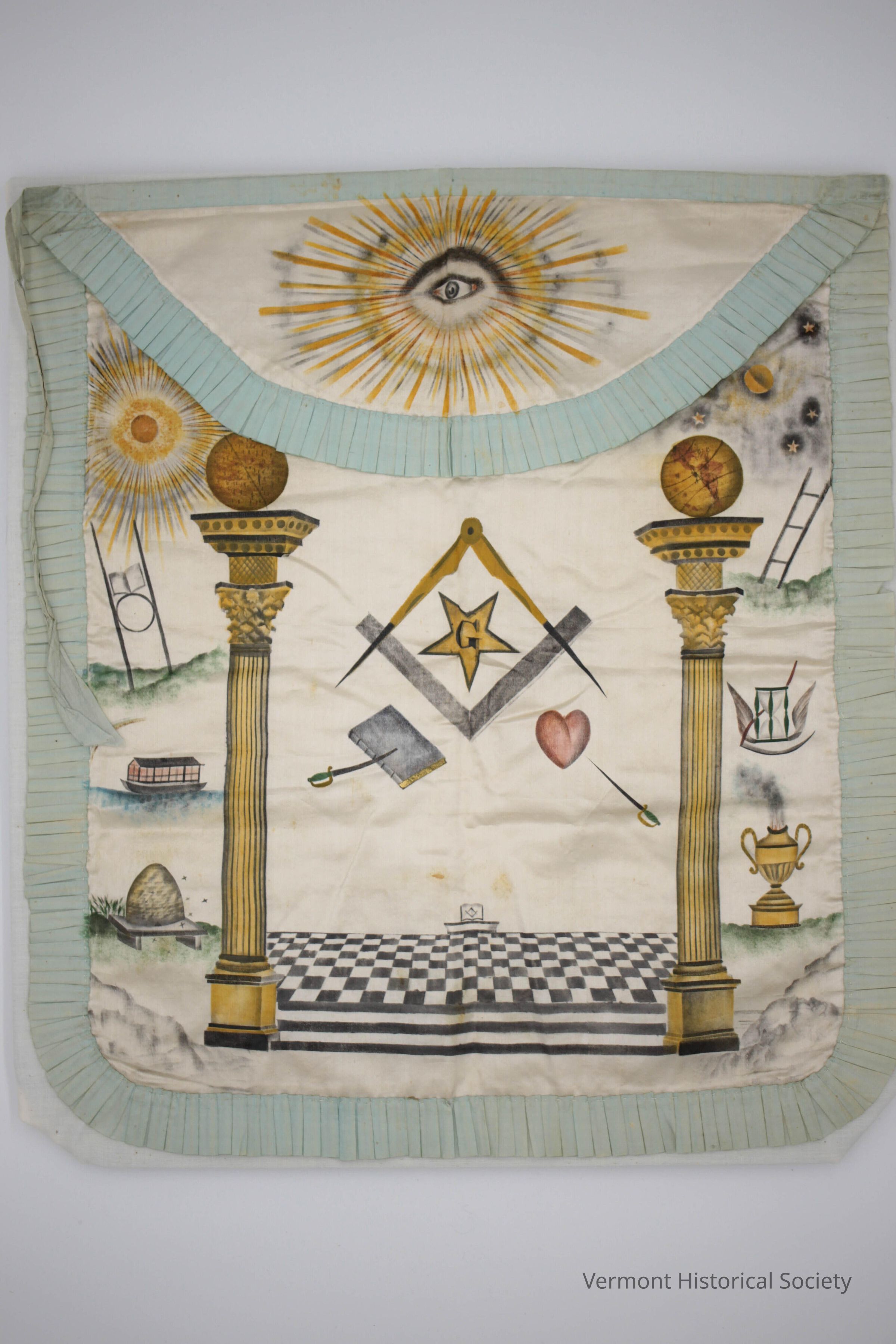 Silk Masonic apron decorated with watercolor and ink. The apron has a semi-circular flap at the top featuring the symbol of the all-seeing eye. The main body of the apron is painted with a design of two golden pillars topped with globes flanking a checkered floor, a compass and square, sword piercing a book, sword piercing a hear, ladder to space, shining sun, a book on stilts, an ark, a beehive, a sand timer with wings, and a burning urn.Context