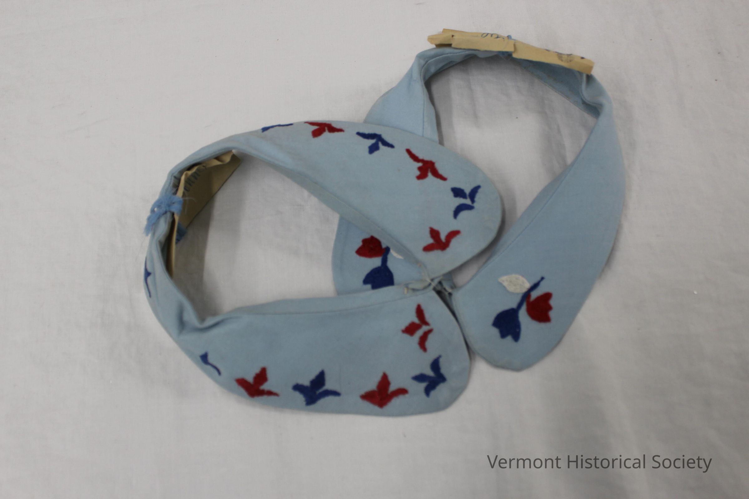 Two light blue attachable collars with pointed edges in front. One has embroidered red and blue birds on it and was made by Georgette Bonnemaine. The other has flowers and was made by Yvette Glamblin.