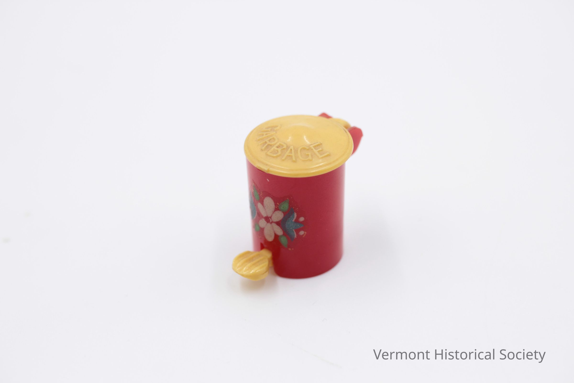 Miniature plastic trash can. The body of the can is red and printed at the front center with a flower in white, blue, and red. The lid is yellow and molded with the word, "GARBAGE". There is a yellow pedal and the center front that raises the lid when pressed down.Context