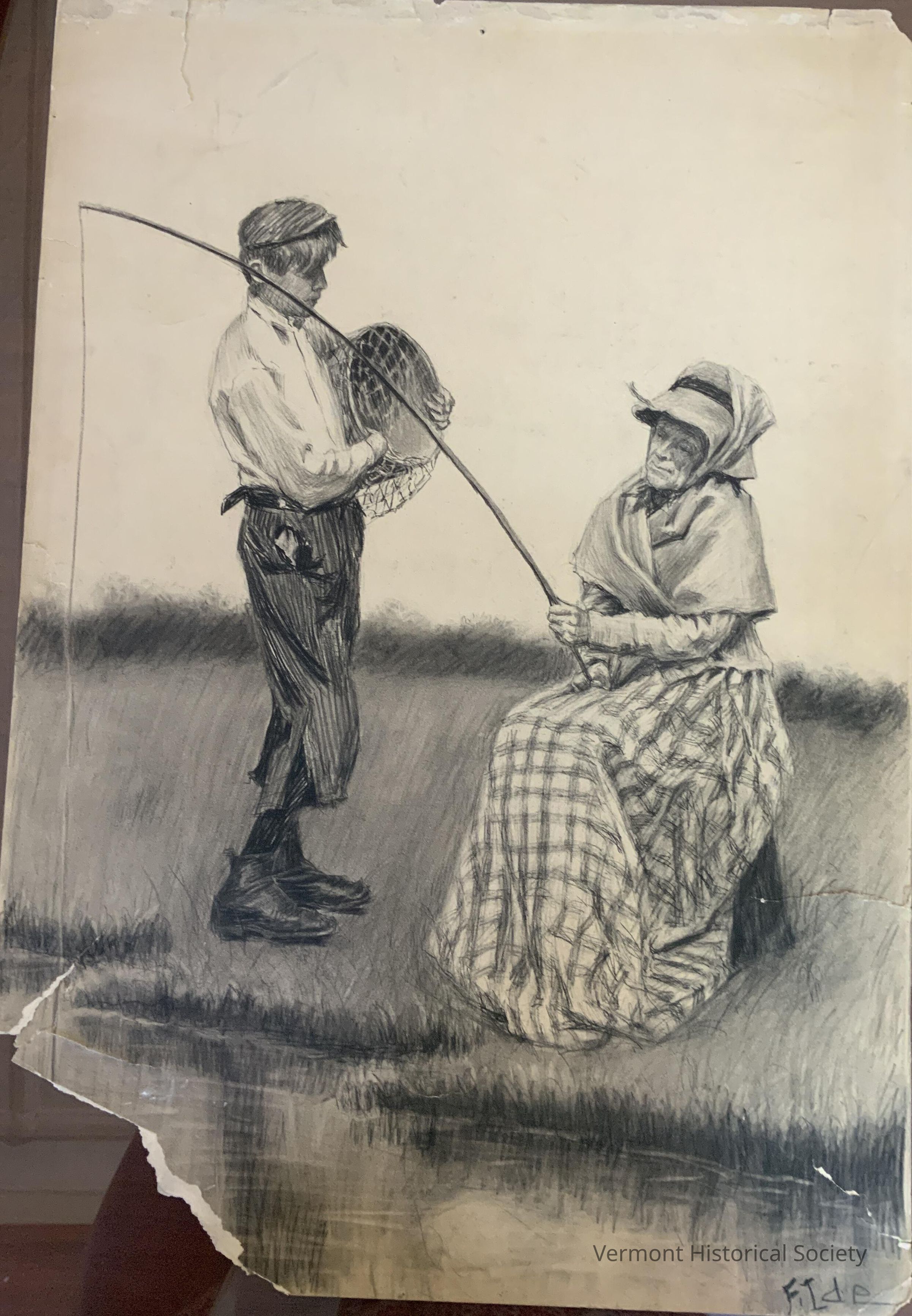 A drawing of a boy and a woman on a grassy bank near a River. The boy is wearing striped pants and a cap and holds a basket with a net. The woman is sitting on a stool and wears a plaid skirt, shawl, and hat. She is fishing in the the river. It is signed in the bottom right corner.Type of Drawing