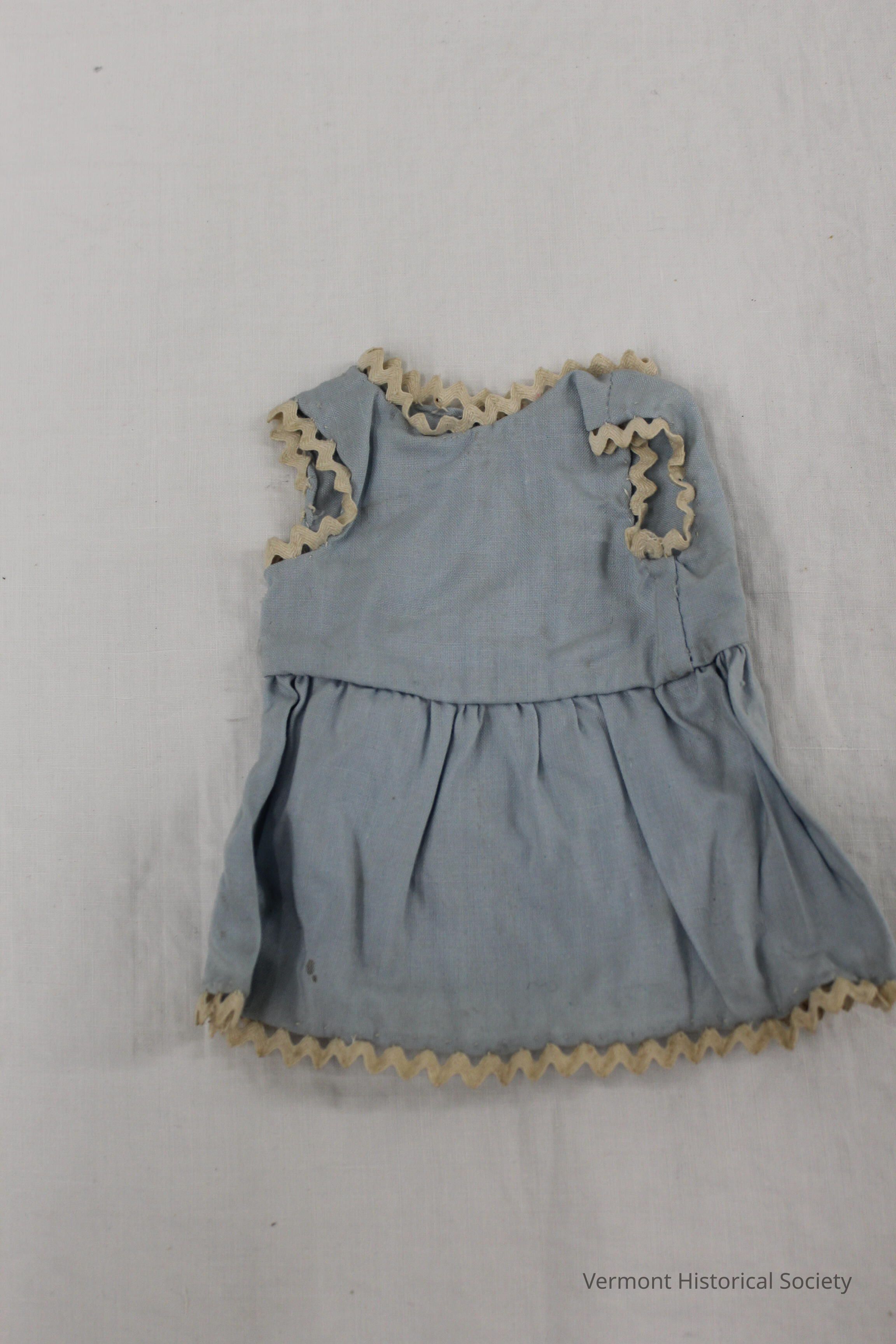 Handsewn, light blue doll dress, sleeveless with white ric-rack on the neck, armholes and hem. Three white buttons on the back.Context