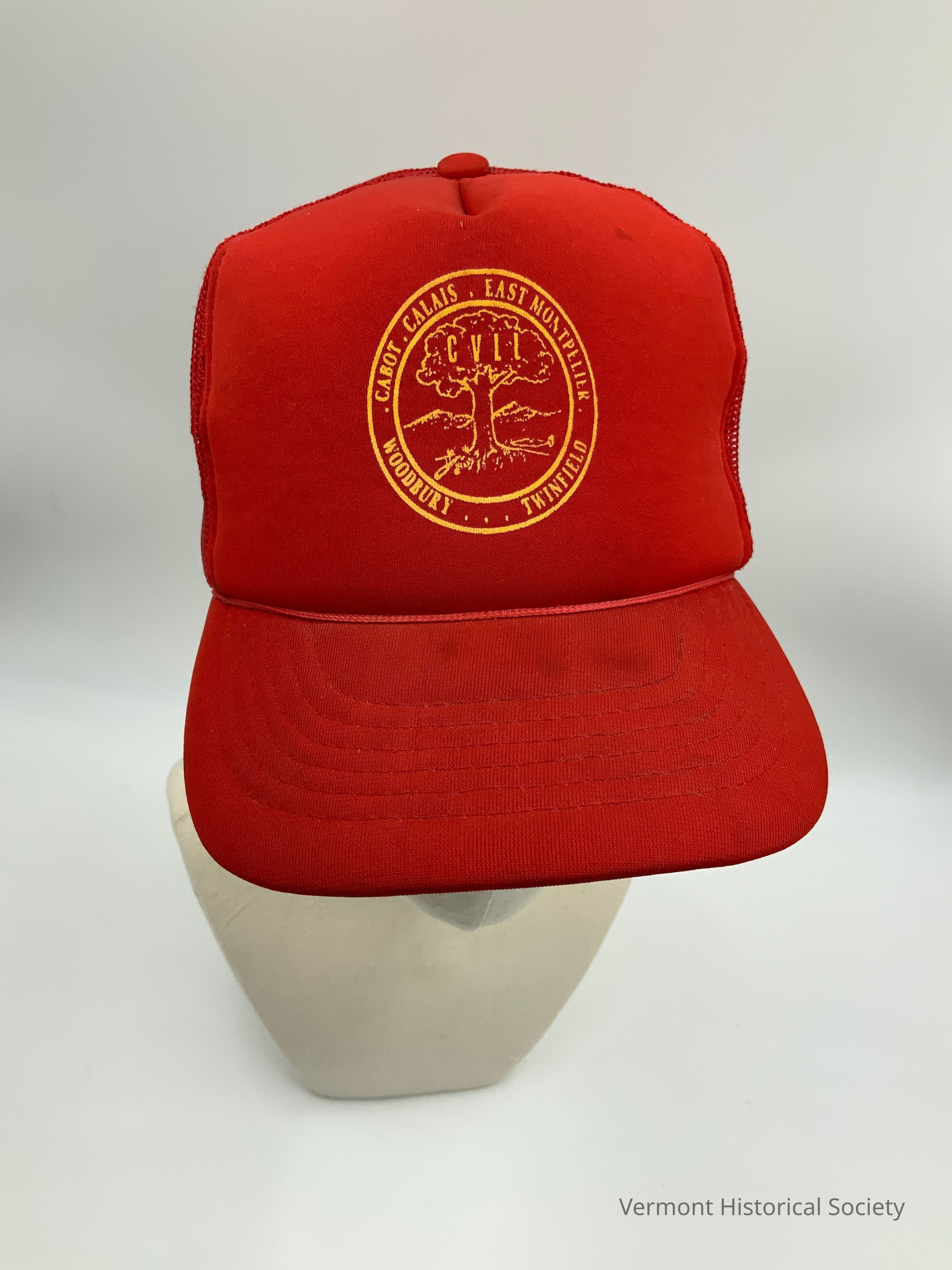 Red baseball cap printed in yellow with a round logo consisting of the words "WOOBURY . CABOT . CALAIS . EAST MONTPELIER . TWINFIELD" surrounding an illustration of a tree with the letters "CVLL" in the foliage. A tag inside reads, "twin city KNITTING/ Polyester/ one Size Fits All/ Made in Dominican Republic", and the name "Steve S" is written inside.