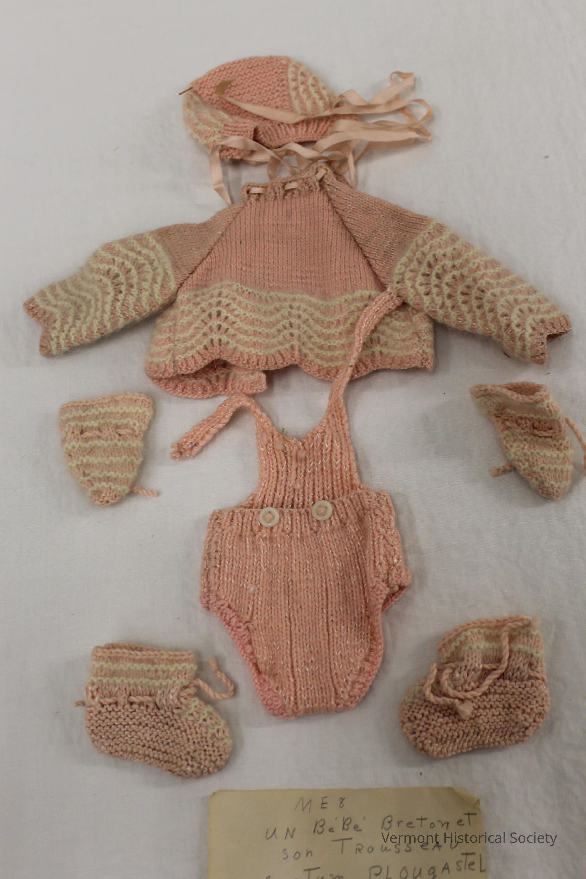 Pink knit baby doll outfit that includes a cap with ribbon ties and white yarn design, a sweater with a ribbon tie at the neck and the white design on the sleeves and lower part of the sweater, a plain pink onsie with bib top and straps that attach with buttons, two thumbless mitts with drawstrings and the white design, and two booties with drawstrings and white design at ankles. The note says "M8", "Un bebe bretonet son trousseau costum plougastel" and then something undetermined in parentheses.Context