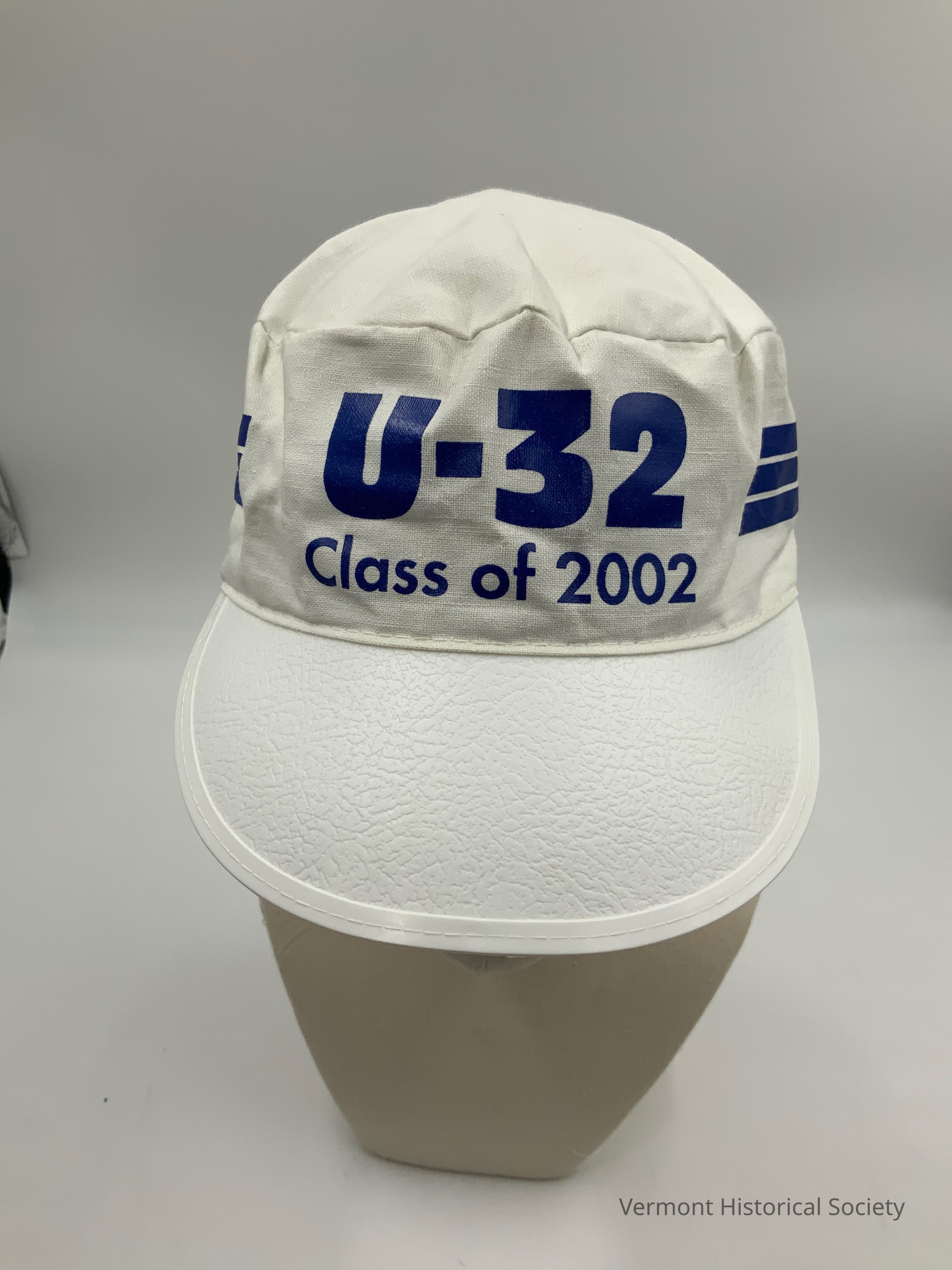 This painters cap is white and made of cotton with a plastic visor. On the crown of the cap, "U-32 Class of 2002", is printed in blue.