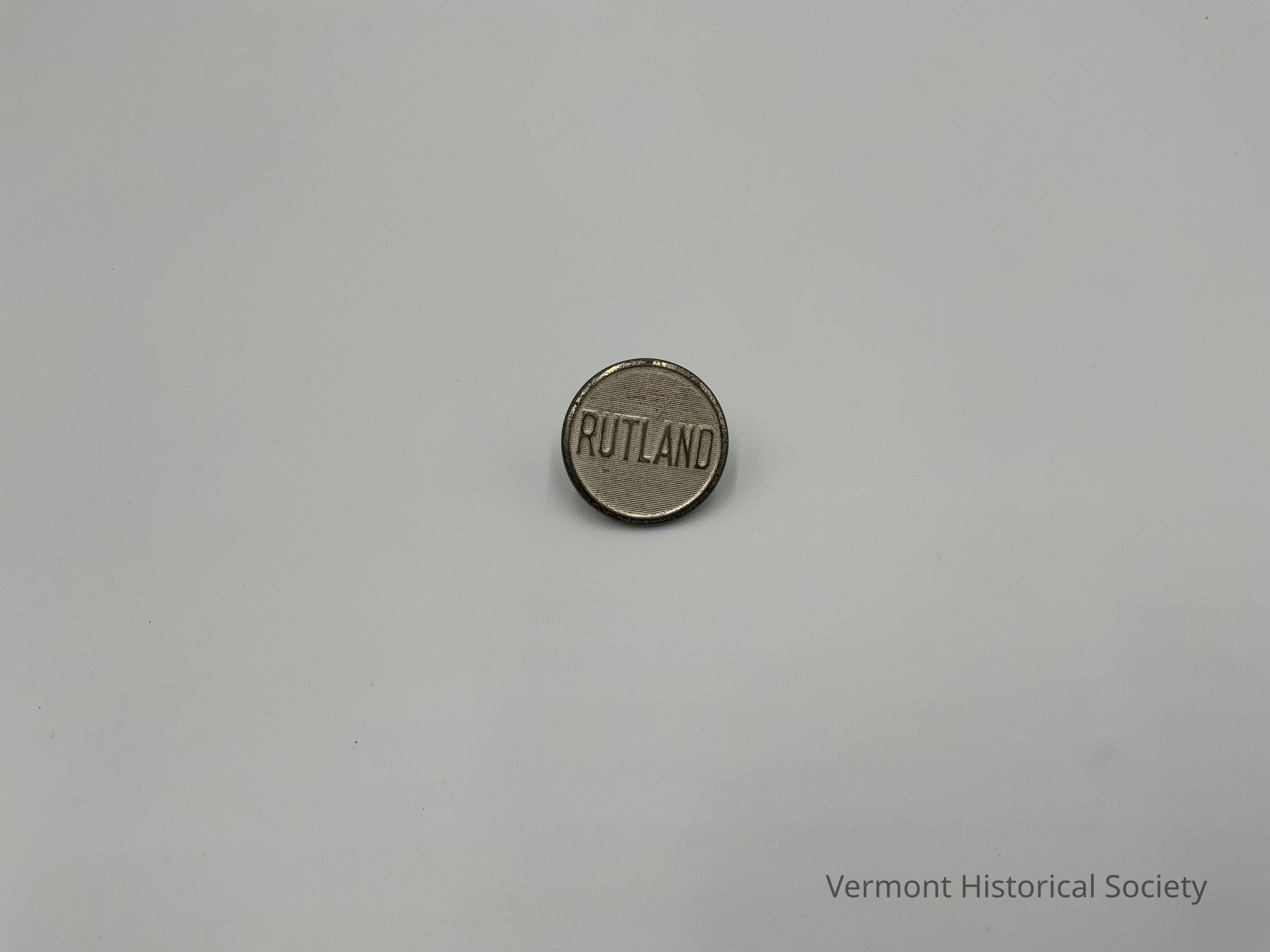 Silver post-backed button with the molded inscription, "RUTLAND", on a striped textured ground.