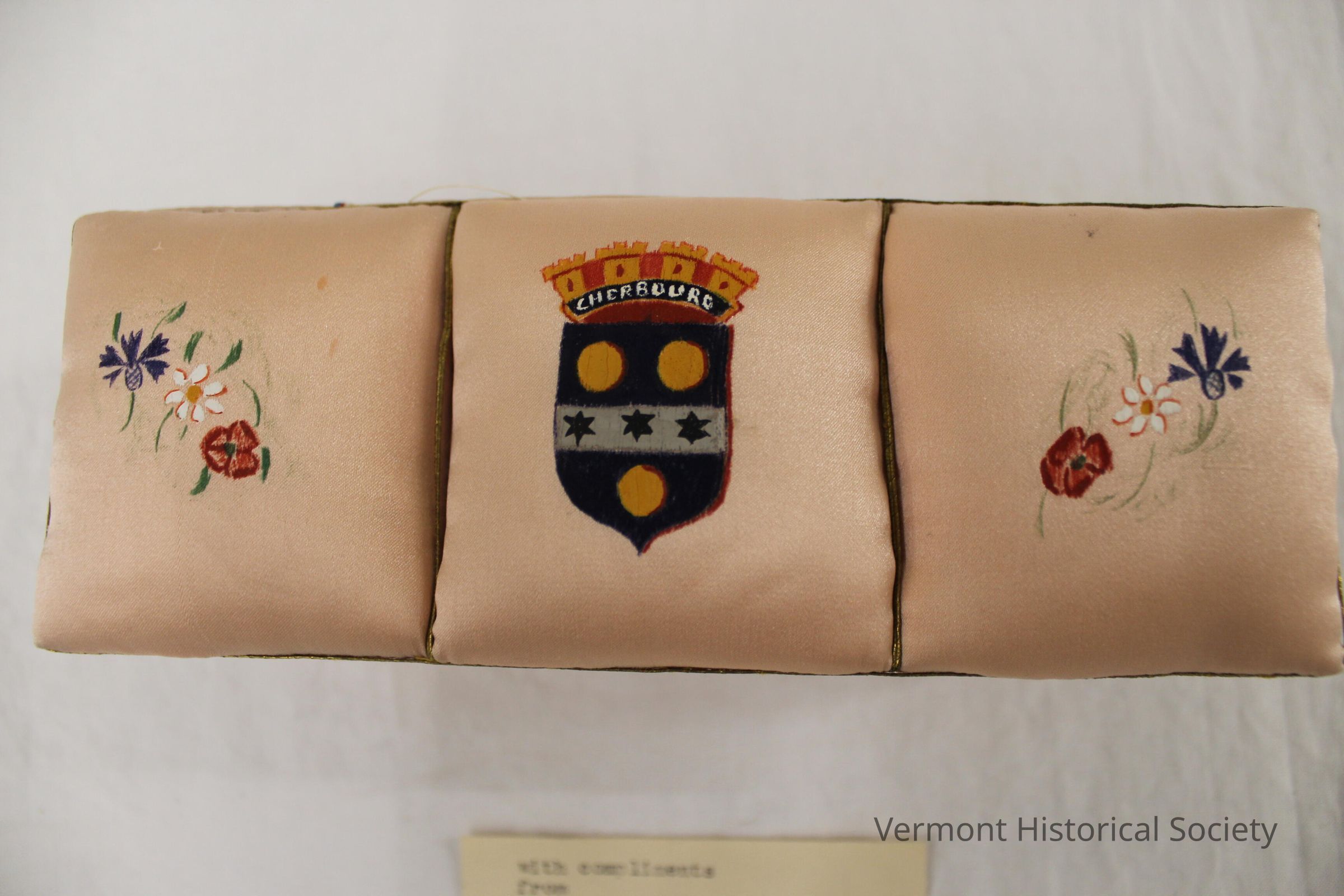 Pink, satin-covered, rectangular box with three puffy sections on the lid edged with tiny gold cord. Two sections are painted with flowers and the middle has a cherbourg crest. The inside is also padded and the top edge has white lace trim. A card with the box reads, "With compliments from Rene Dubreail, director du college moderne technique, who would be glad to start a correspondence intercourse between his pupils and yours."Context