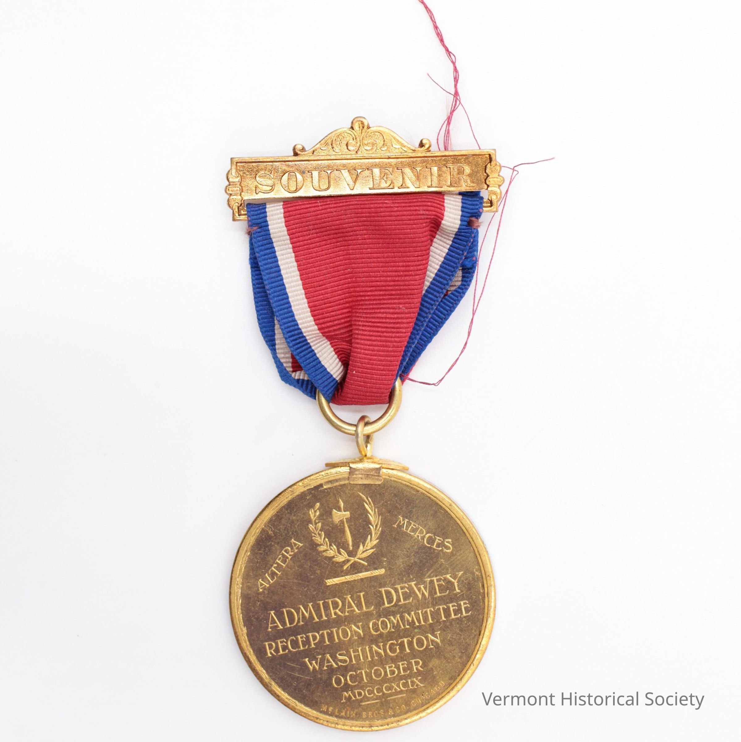 Commemorative medal consisting of a a bar, a ribbon, and a medallion. The bar has decorative scrollwork and the inscription, "SOUVENIR". The ribbon is red with blue and white striped borders. From an eye ring at the bottom of the ribbon hangs a round gold medal with the inscription, "ALTERA MERCES / ADMIRAL DEWEY RECEPTION COMMITTEE WASHINGTON OCTOBER MDCCCXCIX". The other side of the medal has a bust portrait of Admiral George Dewey.Context