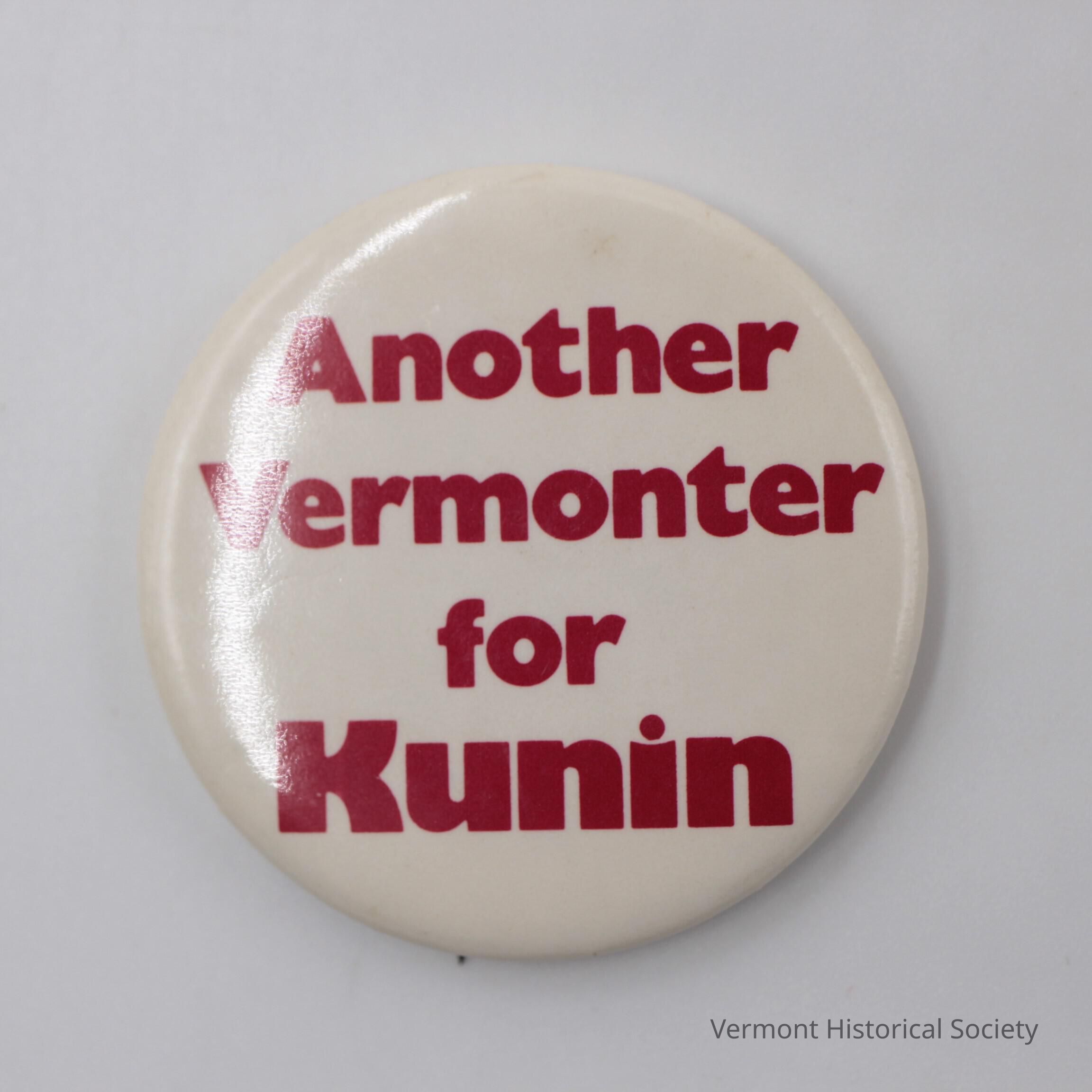 White campaign button with the red inscription, "Another Vermonter for Kunin".