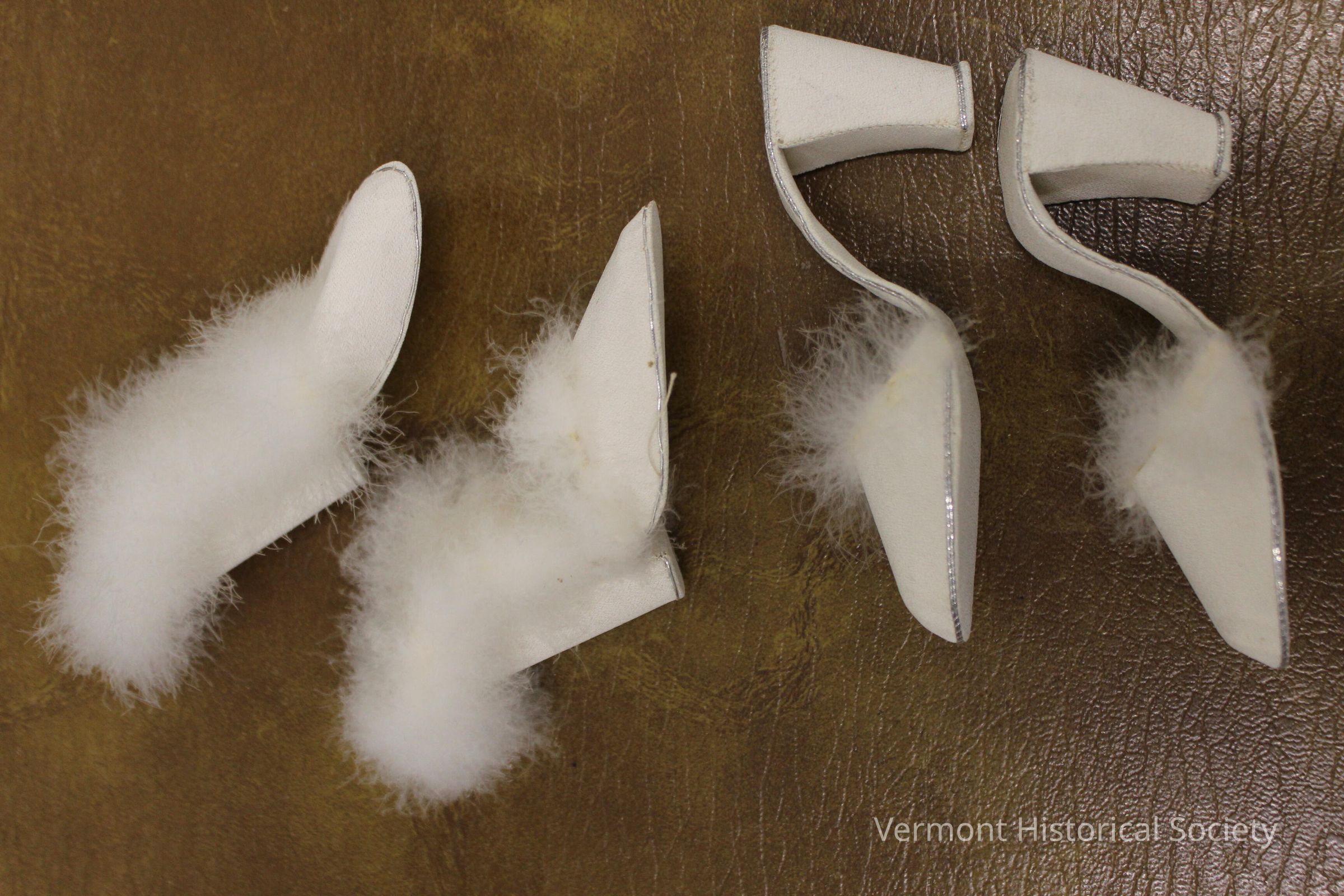 Two pairs of white, high-heeled doll shoes topped with white, fluffy feathers and edged in silver.Context